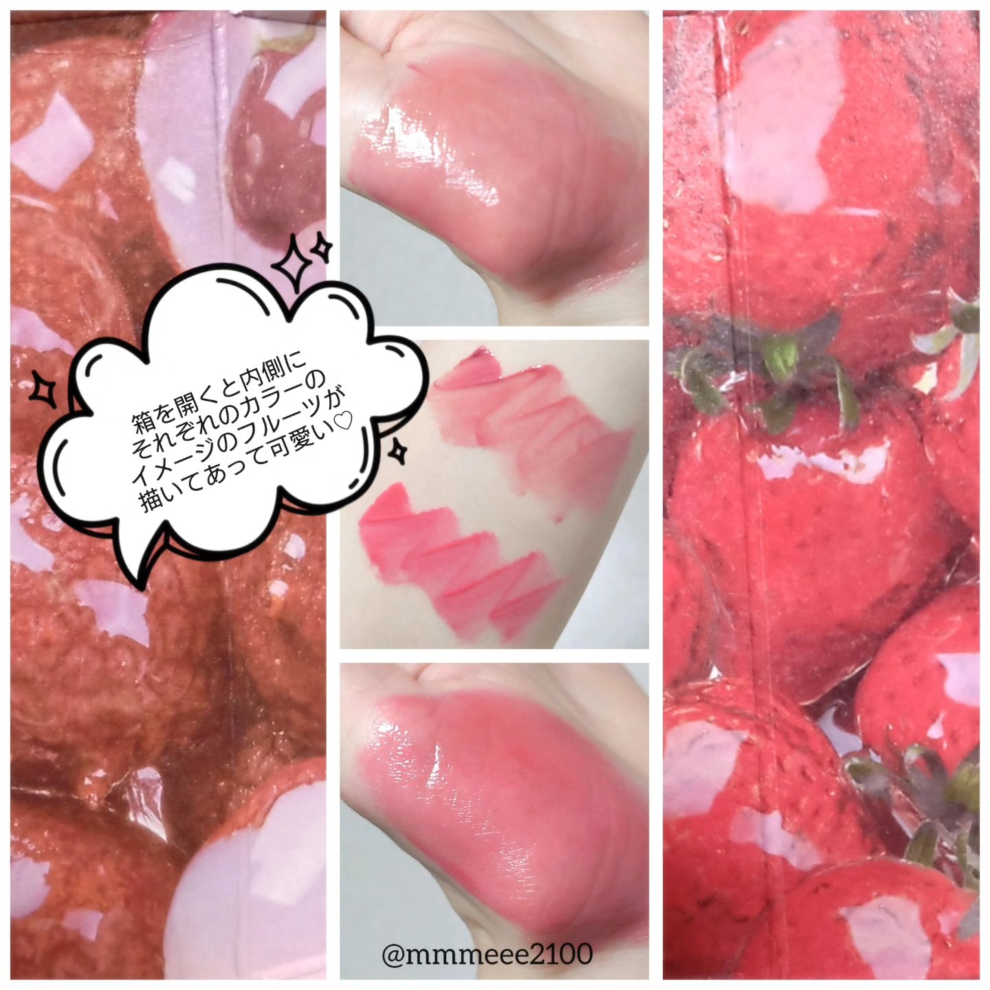 - <01 ソフトアプリコット(Soft Apricot)> 水、リンゴ酸ジイソステアリル、ビスジグリセリルポリアシルアジペート-2、ジフェニルジメチコン、水添ポリイソブテン、トリメチルシロキシフェニルジメチコン、ポリフェニルシルセスキ オキサン、グリセリン、セチルPEG/PPG-10/1ジメチコン、ポリソルベート60、イソステアリン酸ソルビタン、セテアレス-20、1,2-ヘキサンジオール、(アクリル酸ヒドロキシエチ ル/アクリロイルジメチルタウリンNa)コポリマー、スクワラン、フェノキシエタノール、エチルヘキシルグリセリン、香料、水酸化Al、ポリアクリル酸アンモニウム、BG、テトラ(ジ-t-ブチルヒ ドロキシヒドロケイヒ酸)ペンタエリスリチル、酸化チタン、赤104(1)、赤227、黄4、黄5、青1 <02 センチメンタルライチ(Sentimental Lychee)> 水、リンゴ酸ジイソステアリル、ビスジグリセリルポリアシルアジペート-2、ジフェニルジメチコン、水添ポリイソブテン、トリメチルシロキシフェニルジメチコン、ポリフェニルシルセスキ オキサン、グリセリン、セチルPEG/PPG-10/1ジメチコン、ポリソルベート60、イソステアリン酸ソルビタン、セテアレス-20、1,2-ヘキサンジオール、(アクリル酸ヒドロキシエチ ル/アクリロイルジメチルタウリンNa)コポリマー、スクワラン、フェノキシエタノール、エチルヘキシルグリセリン、香料、水酸化Al、ポリアクリル酸アンモニウム、BG、テトラ(ジ-t-ブチルヒ ドロキシヒドロケイヒ酸)ペンタエリスリチル、酸化チタン、赤104(1)、赤227、黄4、黄5、青1 <03 クレバーマンガップル(Clever Mangapple)> 水、リンゴ酸ジイソステアリル、ビスジグリセリルポリアシルアジペート-2、ジフェニルジメチコン、水添ポリイソブテン、トリメチルシロキシフェニルジメチコン、ポリフェニルシルセスキ オキサン、グリセリン、セチルPEG/PPG-10/1ジメチコン、ポリソルベート60、イソステアリン酸ソルビタン、セテアレス-20、1,2-ヘキサンジオール、(アクリル酸ヒドロキシエチ ル/アクリロイルジメチルタウリンNa)コポリマー、スクワラン、フェノキシエタノール、エチルヘキシルグリセリン、香料、水酸化Al、ポリアクリル酸アンモニウム、BG、テトラ(ジ-t-ブチルヒ ドロキシヒドロケイヒ酸)ペンタエリスリチル、酸化チタン、赤104(1)、赤227、黄4、黄5 <04 シャイピーチ(Shy Peach)> 水、リンゴ酸ジイソステアリル、ビスジグリセリルポリアシルアジペート-2、ジフェニルジメチコン、水添ポリイソブテン、トリメチルシロキシフェニルジメチコン、ポリフェニルシルセスキ オキサン、グリセリン、セチルPEG/PPG-10/1ジメチコン、ポリソルベート60、イソステアリン酸ソルビタン、セテアレス-20、1,2-ヘキサンジオール、(アクリル酸ヒドロキシエチ ル/アクリロイルジメチルタウリンNa)コポリマー、スクワラン、フェノキシエタノール、エチルヘキシルグリセリン、香料、水酸化Al、ポリアクリル酸アンモニウム、BG、テトラ(ジ-t-ブチルヒ ドロキシヒドロケイヒ酸)ペンタエリスリチル、酸化チタン、赤104(1)、黄4、黄5、青1 <05 タレンテッドピーチ(Talented Peach)> 水、リンゴ酸ジイソステアリル、ビスジグリセリルポリアシルアジペート-2、ジフェニルジメチコン、水添ポリイソブテン、トリメチルシロキシフェニルジメチコン、ポリフェニルシルセスキ オキサン、グリセリン、セチルPEG/PPG-10/1ジメチコン、ポリソルベート60、イソステアリン酸ソルビタン、セテアレス-20、1,2-ヘキサンジオール、(アクリル酸ヒドロキシエチ ル/アクリロイルジメチルタウリンNa)コポリマー、スクワラン、フェノキシエタノール、エチルヘキシルグリセリン、香料、水酸化Al、ポリアクリル酸アンモニウム、BG、テトラ(ジ-t-ブチルヒ ドロキシヒドロケイヒ酸)ペンタエリスリチル、酸化チタン、赤104(1)、赤227、黄4、黄5 <06 ロージーストロベリー(Rosy Strawberry)> 水、リンゴ酸ジイソステアリル、ビスジグリセリルポリアシルアジペート-2、ジフェニルジメチコン、水添ポリイソブテン、トリメチルシロキシフェニルジメチコン、ポリフェニルシルセスキ オキサン、グリセリン、セチルPEG/PPG-10/1ジメチコン、ポリソルベート60、イソステアリン酸ソルビタン、セテアレス-20、1,2-ヘキサンジオール、(アクリル酸ヒドロキシエチ ル/アクリロイルジメチルタウリンNa)コポリマー、スクワラン、フェノキシエタノール、エチルヘキシルグリセリン、香料、水酸化Al、ポリアクリル酸アンモニウム、BG、テトラ(ジ-t-ブチルヒ ドロキシヒドロケイヒ酸)ペンタエリスリチル、酸化チタン、赤104(1)、赤227、黄4、黄5 <07 ダーリンチェリー(Daring Cherry)> 水、リンゴ酸ジイソステアリル、ビスジグリセリルポリアシルアジペート-2、ジフェニルジメチコン、水添ポリイソブテン、トリメチルシロキシフェニルジメチコン、ポリフェニルシルセスキ オキサン、グリセリン、セチルPEG/PPG-10/1ジメチコン、ポリソルベート60、イソステアリン酸ソルビタン、セテアレス-20、1,2-ヘキサンジオール、(アクリル酸ヒドロキシエチ ル/