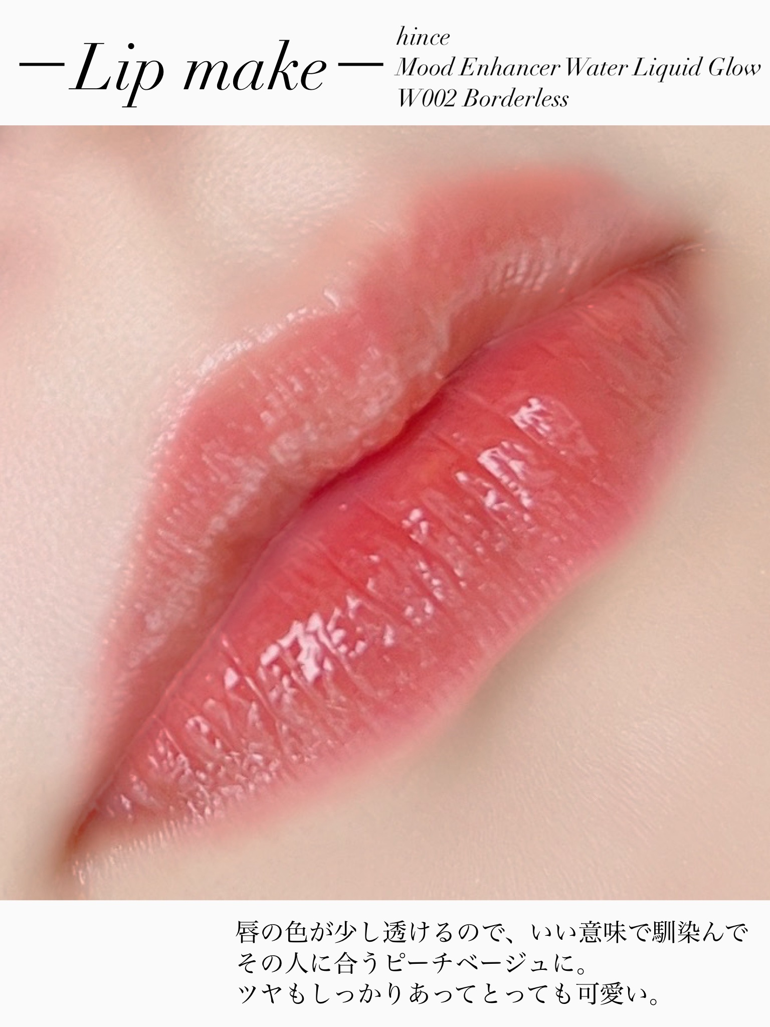 唇に光を含んだようなウォーターグローテクスチャー💎 こちらのボーダーレスは半透明に染み込んで爽やかさを与えるピーチベージュ🍑 これもツヤすごくて縦じわを消してくれる👄 色持ちも問題なくて汚くならないです🫶 こないだのBBIAのチャイと色味似てる! チャイよりちょっと赤みを抜いた色🙂 これもイエベさんおすすめ🧡
