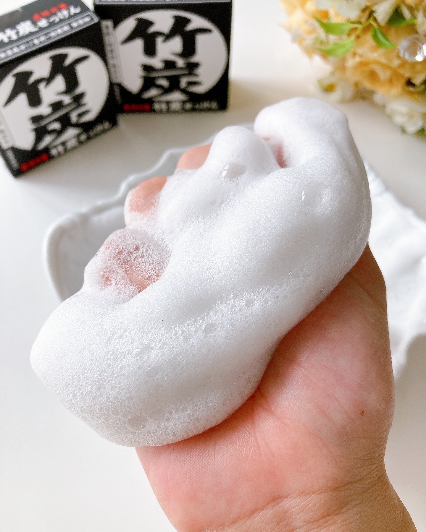 成分は石鹸素地と竹炭と水だけ。植物油(大豆・パーム・菜種)から作った石鹸に汚れをしっかり吸着してくれる竹炭を配合した自然派炭石鹸✨️ 敏感肌の人から、赤ちゃんにもそして炭で消臭効果も期待できるから加齢臭が気になる方も…つまり、我が家では全員が使える炭石鹸💗 アトピー持ちだけど、刺激感もなくなんなら普段使っているソープよりも使い心地がいい😆さっぱりとした使用感だけどツッパることはなく洗っている途中でも泡がヘタらず弾力のある泡に包まれて洗えるので気持ちいい☺️