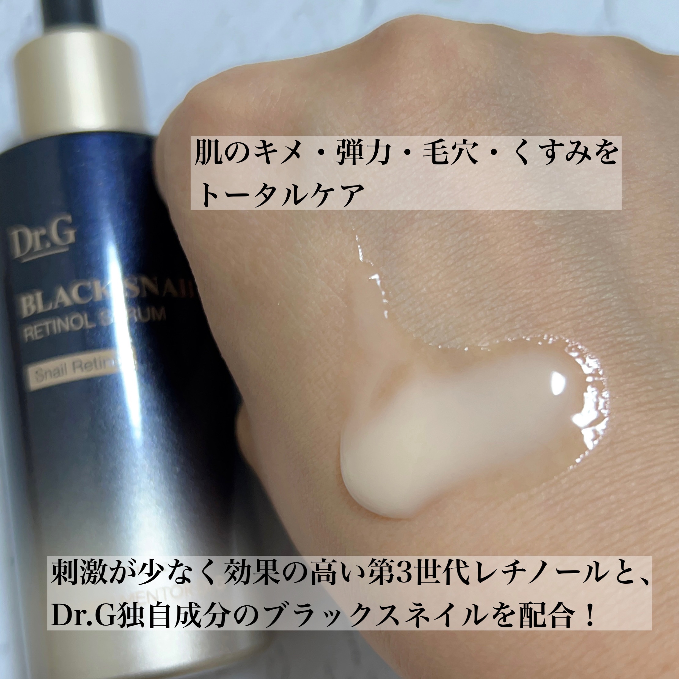 - ブラックスネイル*とレチノール*を配合した、若々しい肌印象に導く美容液です。 Dr.Gのレチノールは独自の成分である、ブラックスネイルレチノール*を使っています! 肌に高い保湿感を与え、肌のキメを整え、弾力やハリのケアを助けるだけでなく、肌の乾燥くすみをケアし、明るい印象のぷるんっとハリのある肌に導きます。 *整肌成分