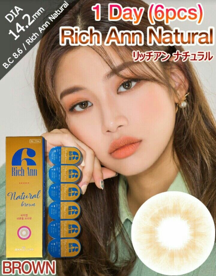 《[1 Day/ブラウン/BROWN] リッチアン ナチュラル ワンデー - Rich Ann Natural - 1 Day (6pcs) [14.2mm]》 ナチュラルなオレンジブラウンのカラコン💡秋makeに合いそうなブラウン🍁🌰✨ ◎商品名→リッチアン ナチュラル ワンデー ●COLOR→ブラウン ●使用期間→1 Day (6pcs) ●価格→990円 ●全体直径(DIY)→14.2mm ●着色直径→12.0mm ●B.C(ベースカーブ)8.6mm 中央のみに、明るいオレンジブラウンが入ったカラコン💡 装着すると、中央にだけほんのりブラウンが入って、ふんわりした印象の瞳になり、ナチュラルカラコンのカテゴリーに入るかな?というくらいナチュラルで、普段使いしやすいカラコンです😊✨ オレンジブラウンの色味が、秋のメイクにもとても良く合いそうで装着感も良かったので大変オススメです💞🍁💞 #アイレンズ #韓国カラコン #カラコン #カラコン #ILENS