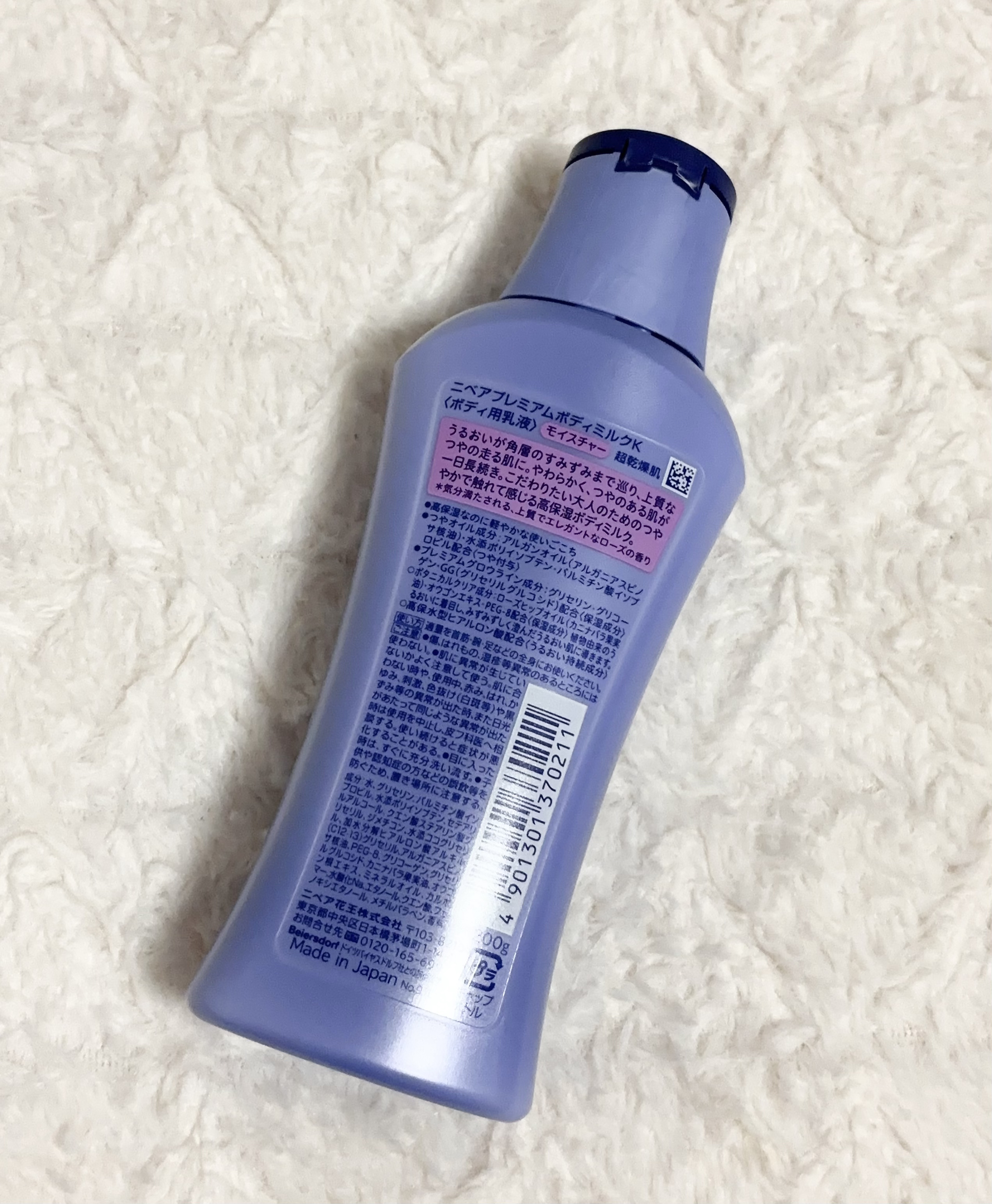 裏面にはモイスチャー超乾燥肌、と記載されてる 私はどちらかというとボディは敏感肌アトピー肌ですが、秋冬に使うのでしっとり系を選びました 高保湿なのに軽やかな使いごこちではあります 同じニベア プレミアムボディミルクのシリーズでは、夏の暑い時期に使った『ホワイトニグ』のほうがさっぱりめではあるものの使い心地が全体的に好み。