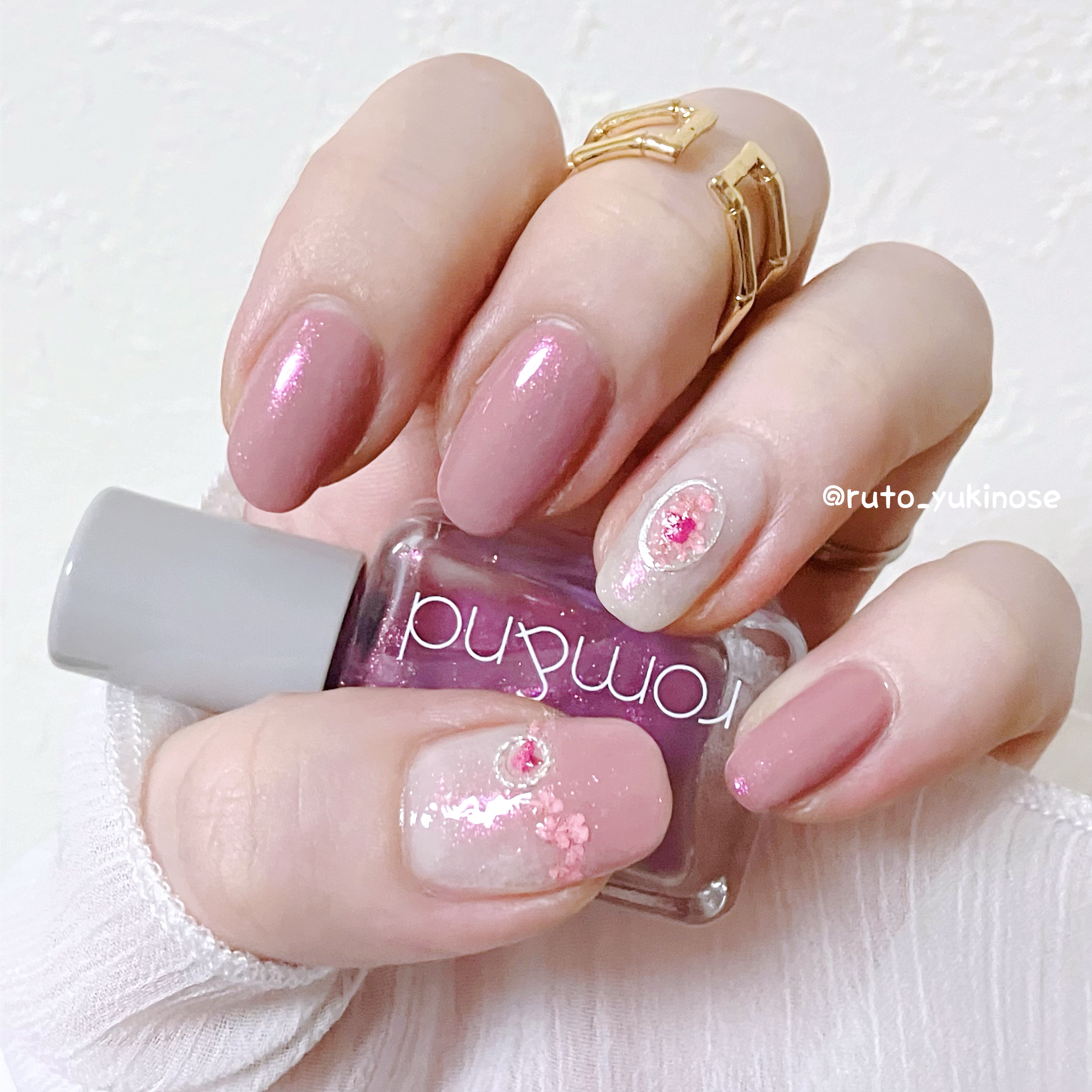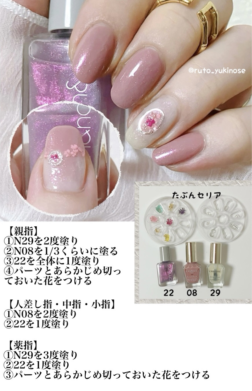 春はやっぱり桜ネイルがしたくなるね🌸✼••┈┈••✼••┈┈••✼••┈┈••✼••┈┈••✼【使ったもの】・キャンメイクカラフルネイルズN08ミスティモーヴ・キャンメイクカラフルネイルズN29ミルクシロップ・ダイソーピンクラメ・セリア桜のシ...