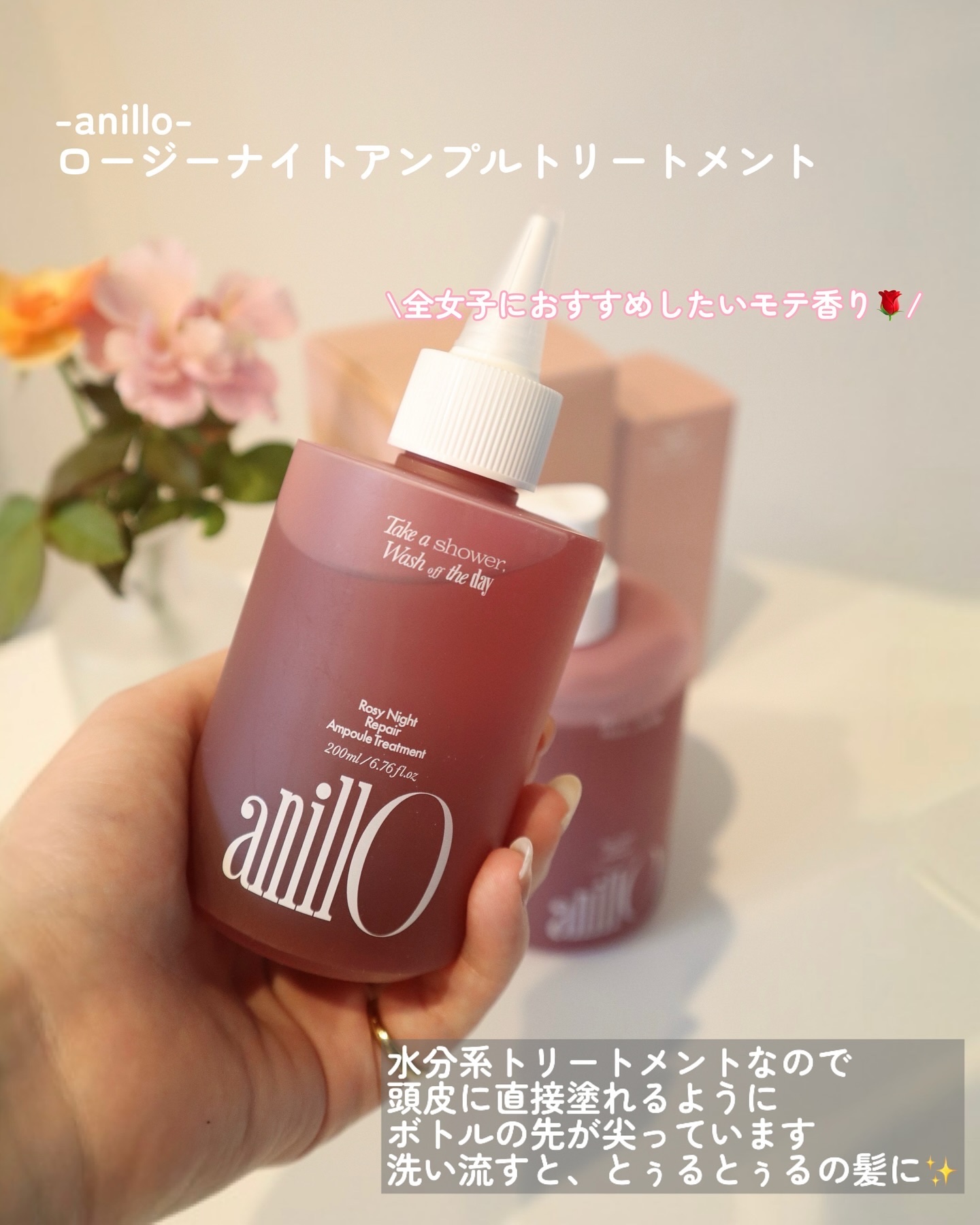 ローズムスクの香りで癒される、おしゃれなパケのヘアケア🌷♡ANILLO・ロージーナイトリペアシャンプー450ml・アンプルトリートメント200ml・ロージーナイトヘアエッセンス50mLポイント💡・ロージーナイトリペアシャンプー✔️ローズ水を4...