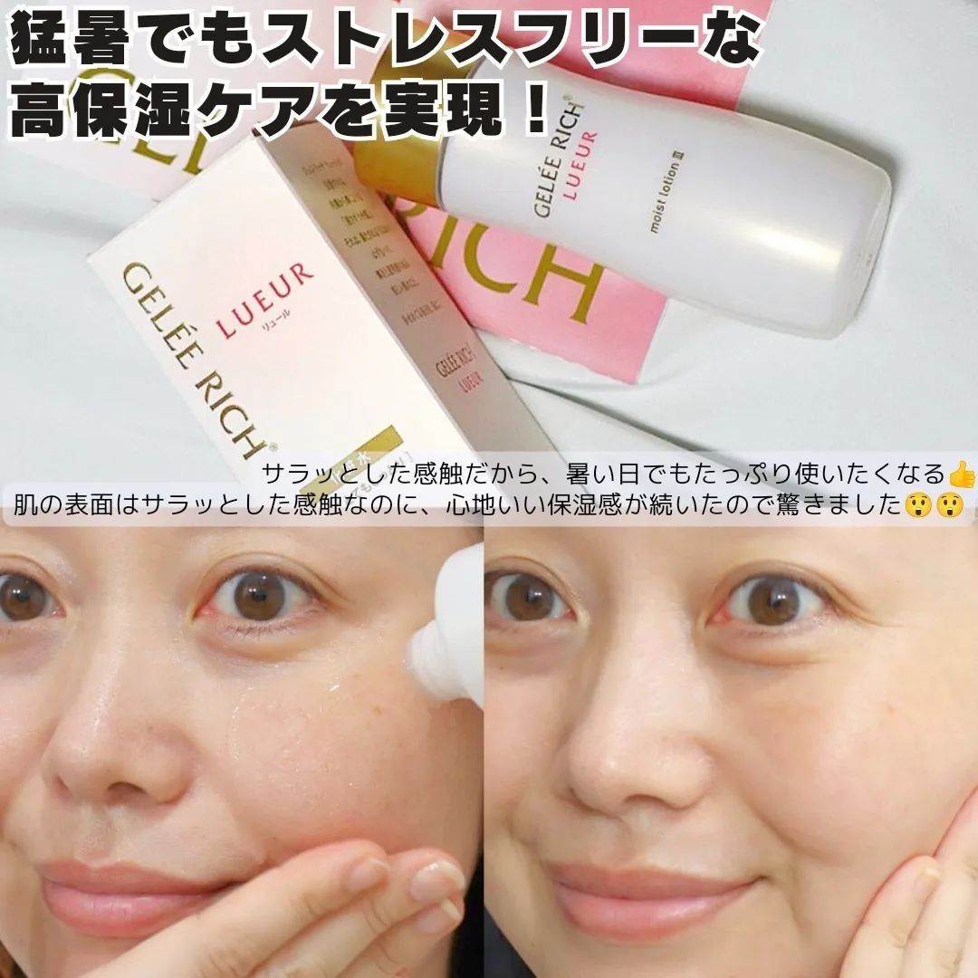 エイジングケアライン〜✨️ 角層にすばやく浸透して、キメの整った透明美肌に導いてくれるそうだよ🥰 ジュレリッチ リュールの化粧水は3種類あってその中でも最も高保湿の化粧水🤍 角層のすみずみまで潤いで満たして、弾むようなツヤ肌へ…💫⭐︎ かなり高保湿だから乾燥肌さんに全力でおすすめ!輝きに満ちたうるうるお肌目指そうぅ🫰