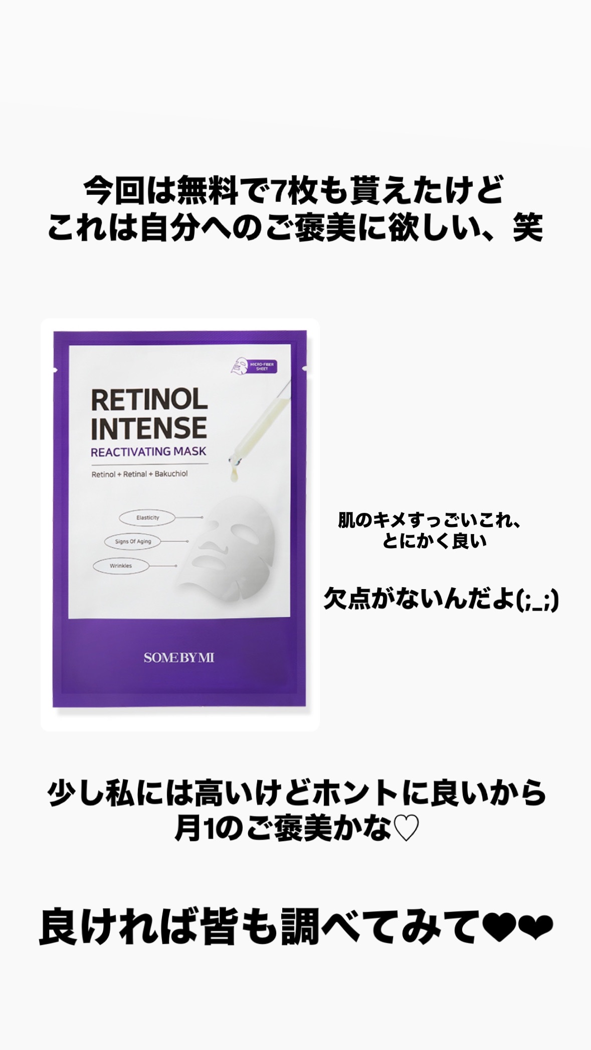 まじで自分でもこんなに感動したのは初めてです笑 リプスのプレゼントで無料で頂いたのですがこれは素晴らしいですよ???!! このパックに入ってるレチノールは敏感肌でも使えるように作られてるので敏感肌で乾燥肌の私は最高でした😭👏✨ 液ひたっひたでシートも触り心地良くて使い終わったパックずっとモミモミしてました笑笑 化粧ノリもよくなりました!!!!!!