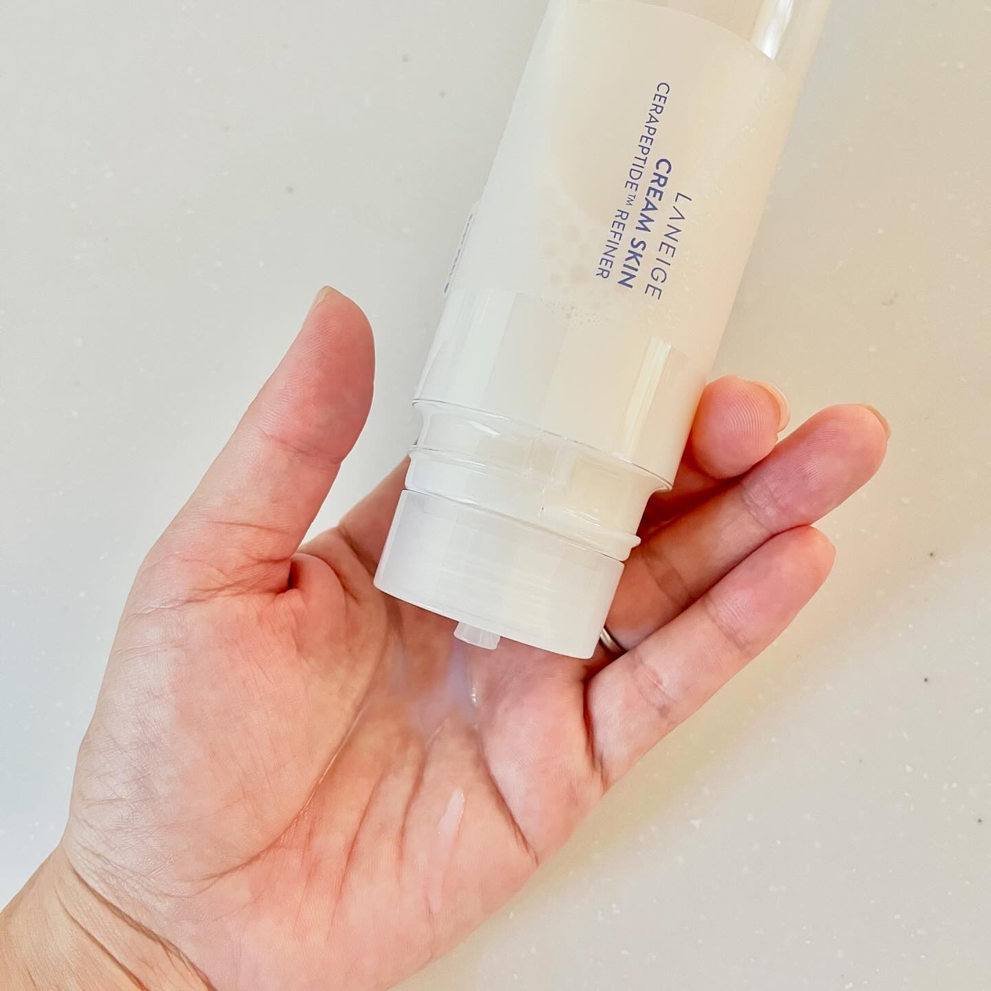 クリームを化粧水に溶け込ませた高保湿ローション LANEIGE(ラネージュ)「 クリームスキン ローション」 サラサラとしたテクスチャーです。乳白色なのでとろっとしているイメージでしたが、手に取ってみるとサラサラとしていて、びっくりしました。 軽いつけ心地なのに、このもちっとしっとりとした感じ、お気に入りです。