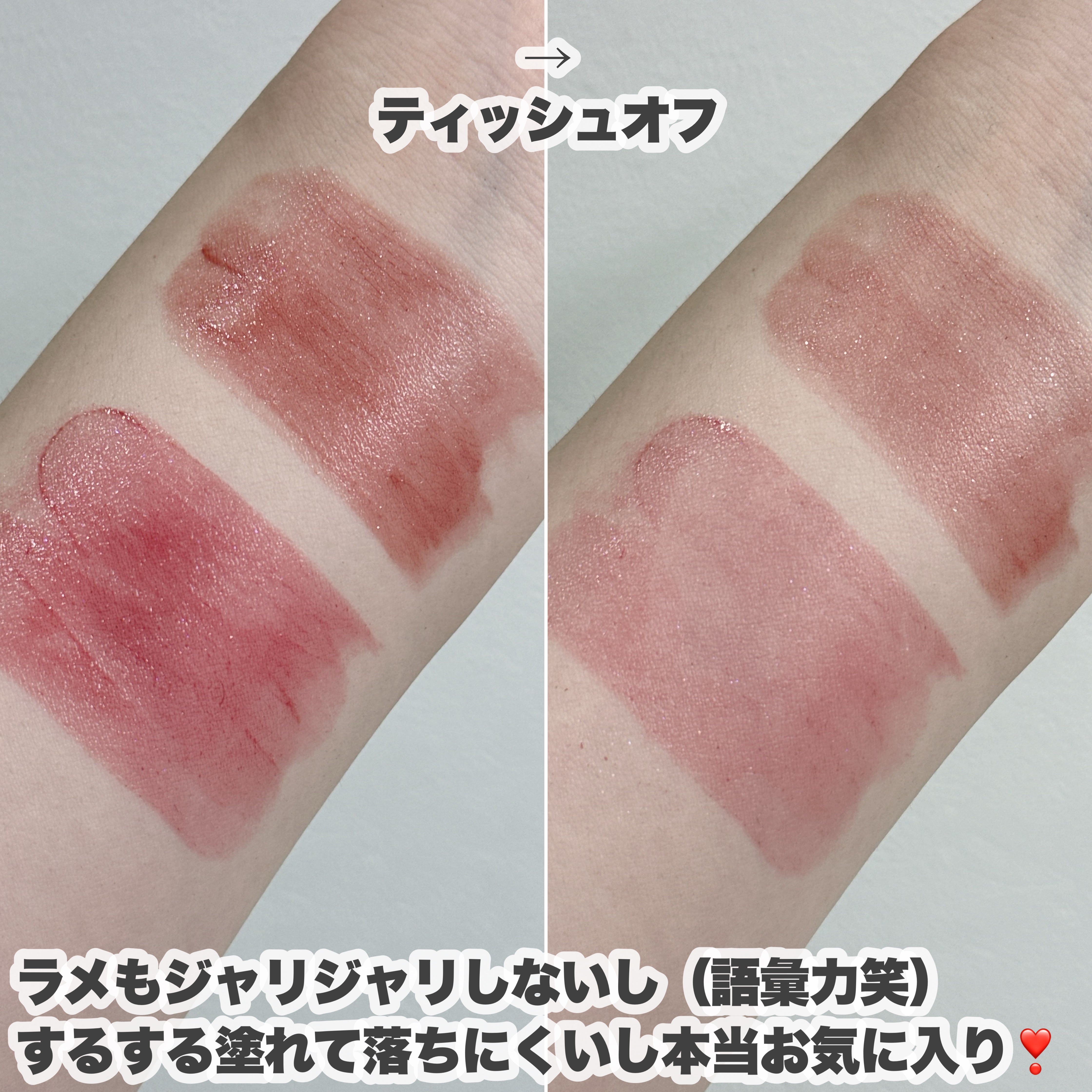 見た目は安定に可愛いし 持ってるだけでテンションあがる🤍 リップパック効果もあり 何と言ってもツヤも発色も凄い🌼 マスクうつりもしますし、持ちは良くないですが 手にスウォッチした際には少し残りました🌼 マスク生活が早く終わることを願って 1本買っておくのがオススメ🤍