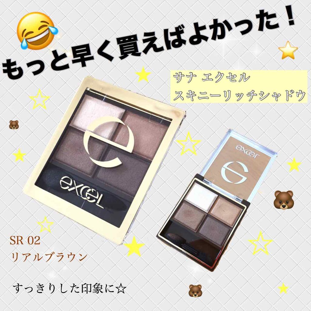 万能アイシャドウexcelスキニーリッチシャドウ人生で初めて買ったのはエクセルのスキニーリッチシャドウ!使いやすいし、発色も良いから最初のアイシャドウとしてはとてもちょうど良い🙆♀️私が買ったのは「SR03 ロイヤルブラウン」SR03は自然...