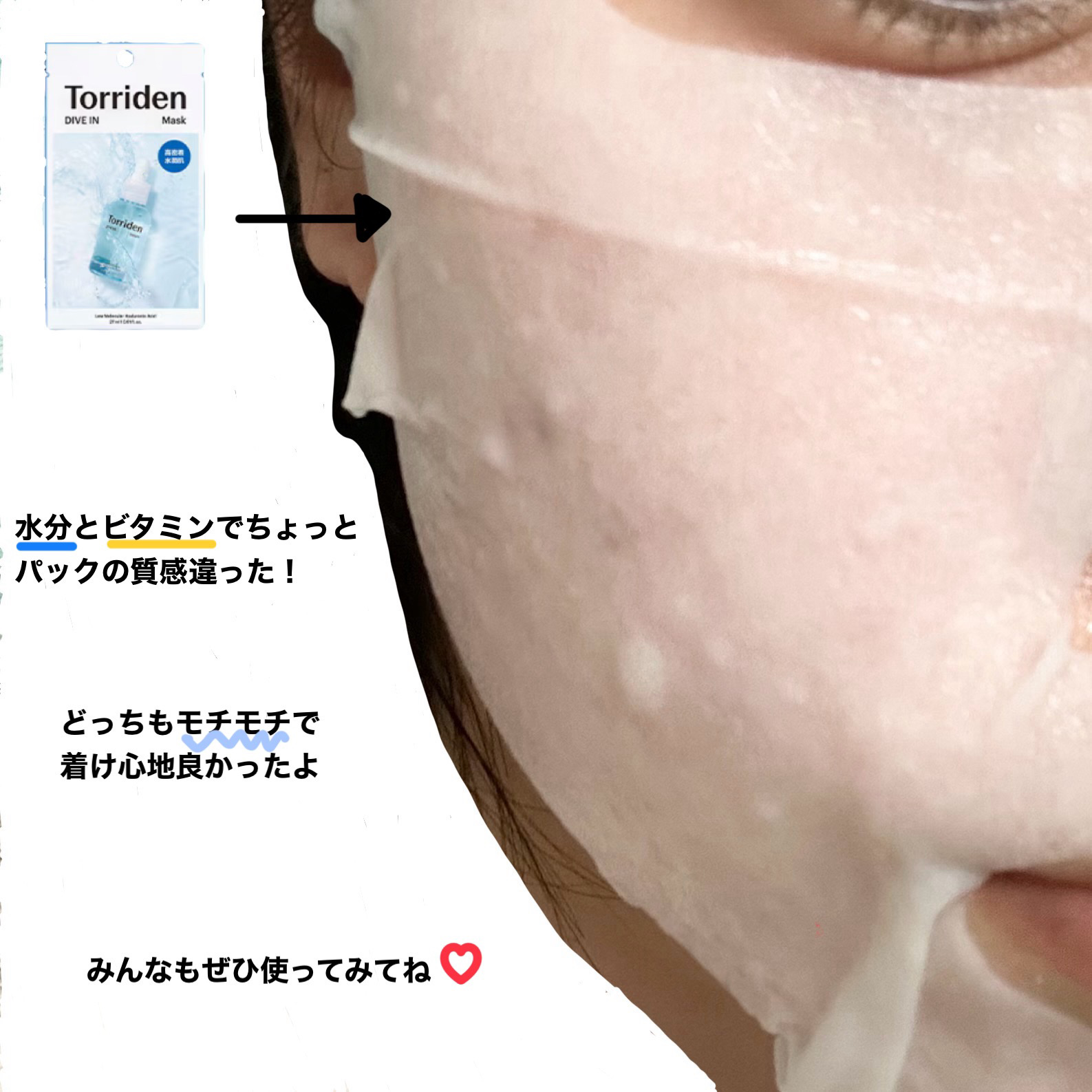 Torridenのダイブイン マスクです! なんと1パックに27mlも美容液が入ってる!!美容液約1本分ってすごすぎる😮 乾燥する今の時期はTorridenのダイブインマスクを使ってなんとか乗り切りましょう!