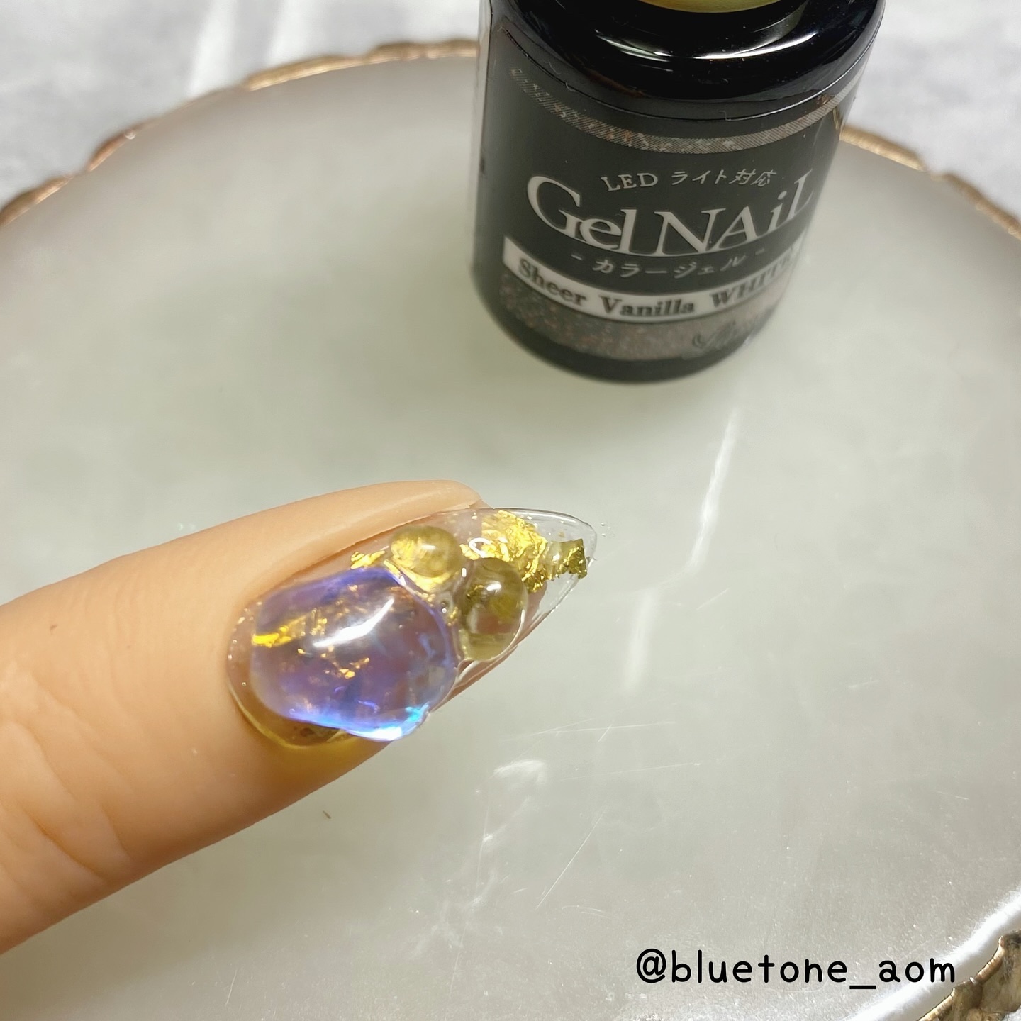 ラメがしっかりしてるし クリアカラーが入ってるから オーロラパウダー無しでも 充分キラキラしました! 反射強めのフィルムなので 実物はもっと うるうるとキラキラが強いです! ビー玉みたい🥺 ネイルシール長持ちさせたいけど ちょっと飽きてきたな〜って時とかに 全然違った印象になるのでオススメです! Seriaのベースジェル 本当にうるうるネイルしやすいので オススメしたい🙆♀️