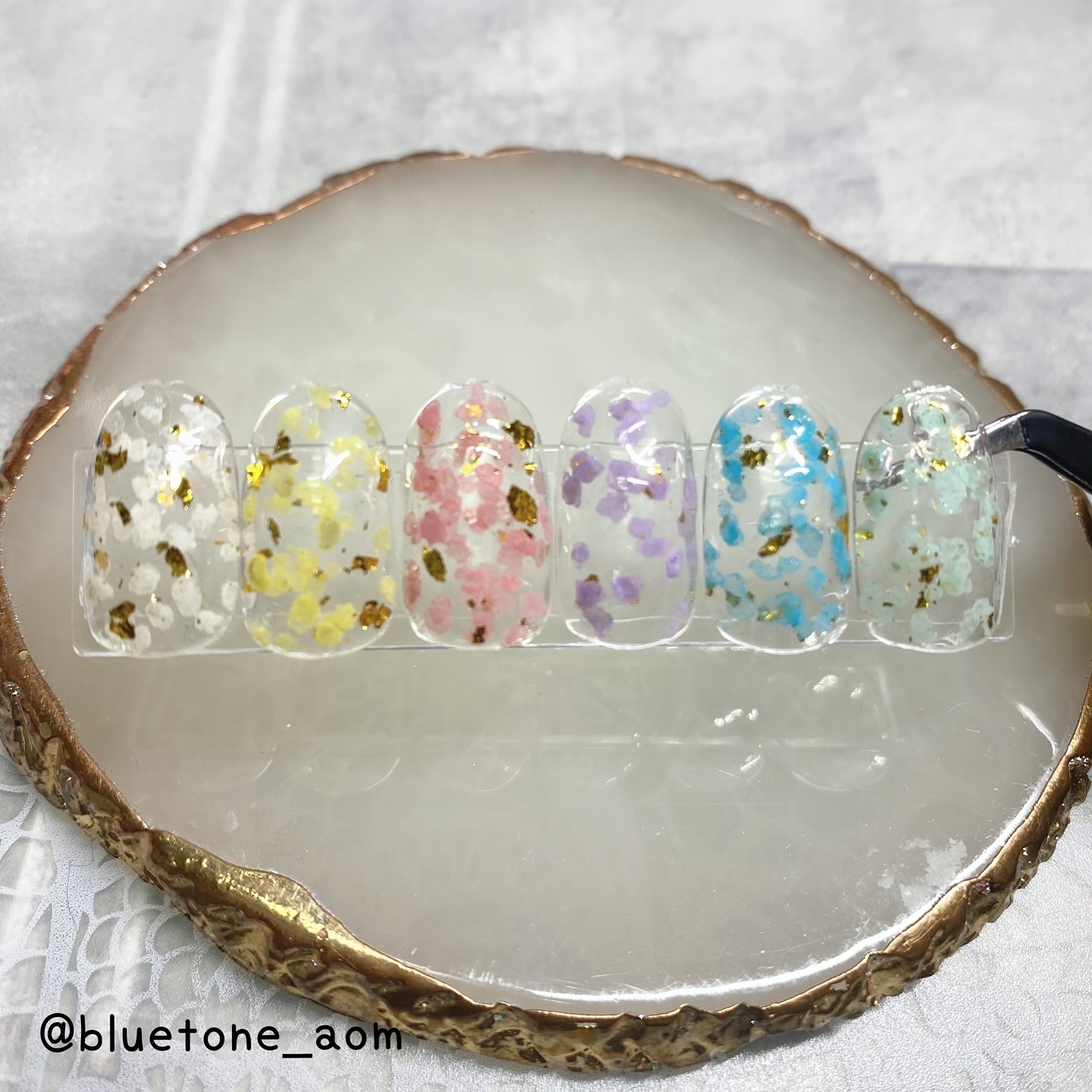 ラメがしっかりしてるし クリアカラーが入ってるから オーロラパウダー無しでも 充分キラキラしました! 反射強めのフィルムなので 実物はもっと うるうるとキラキラが強いです! ビー玉みたい🥺 ネイルシール長持ちさせたいけど ちょっと飽きてきたな〜って時とかに 全然違った印象になるのでオススメです! Seriaのベースジェル 本当にうるうるネイルしやすいので オススメしたい🙆♀️