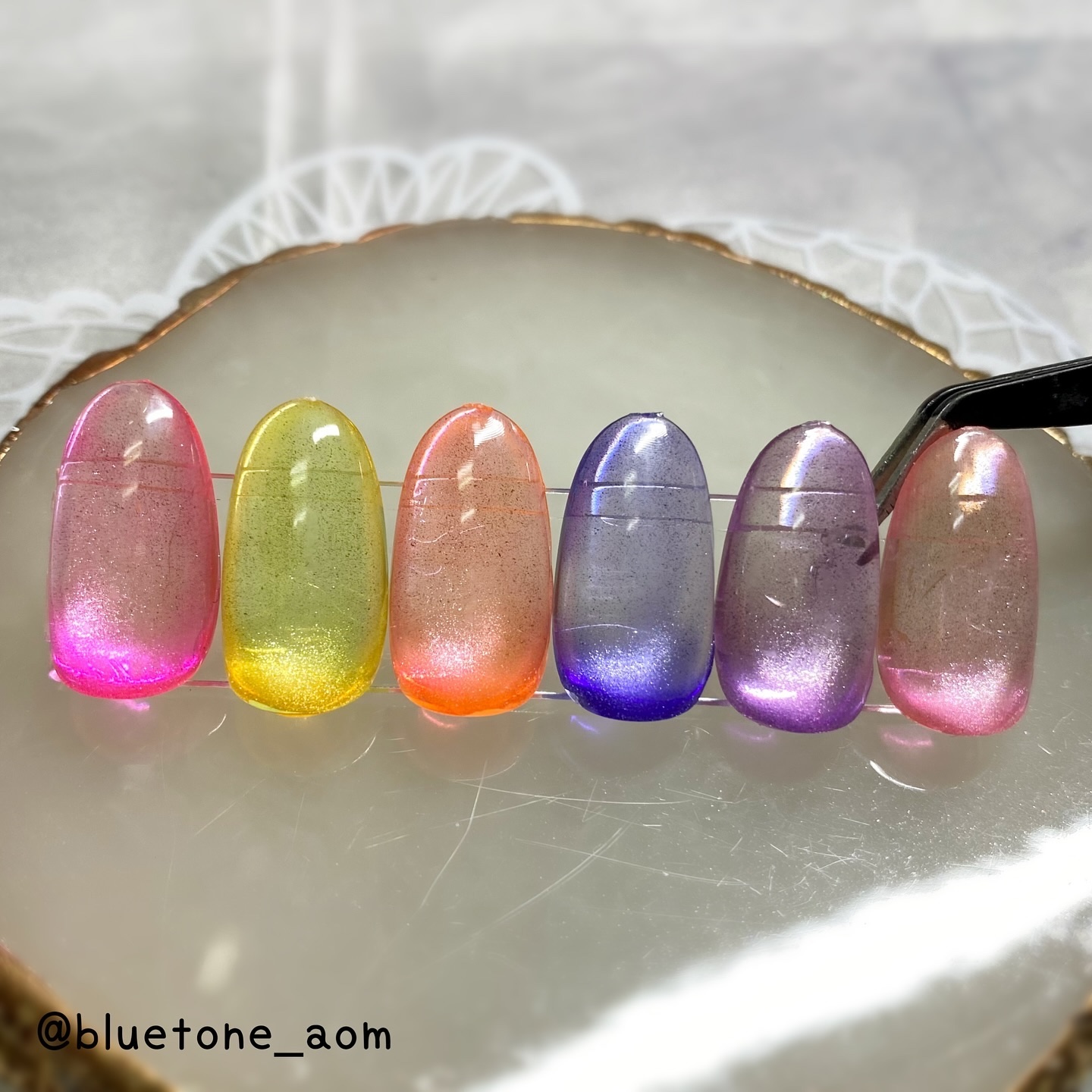 ラメがしっかりしてるし クリアカラーが入ってるから オーロラパウダー無しでも 充分キラキラしました! 反射強めのフィルムなので 実物はもっと うるうるとキラキラが強いです! ビー玉みたい🥺 ネイルシール長持ちさせたいけど ちょっと飽きてきたな〜って時とかに 全然違った印象になるのでオススメです! Seriaのベースジェル 本当にうるうるネイルしやすいので オススメしたい🙆♀️