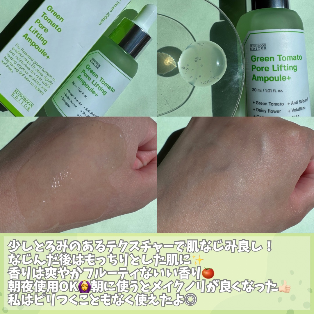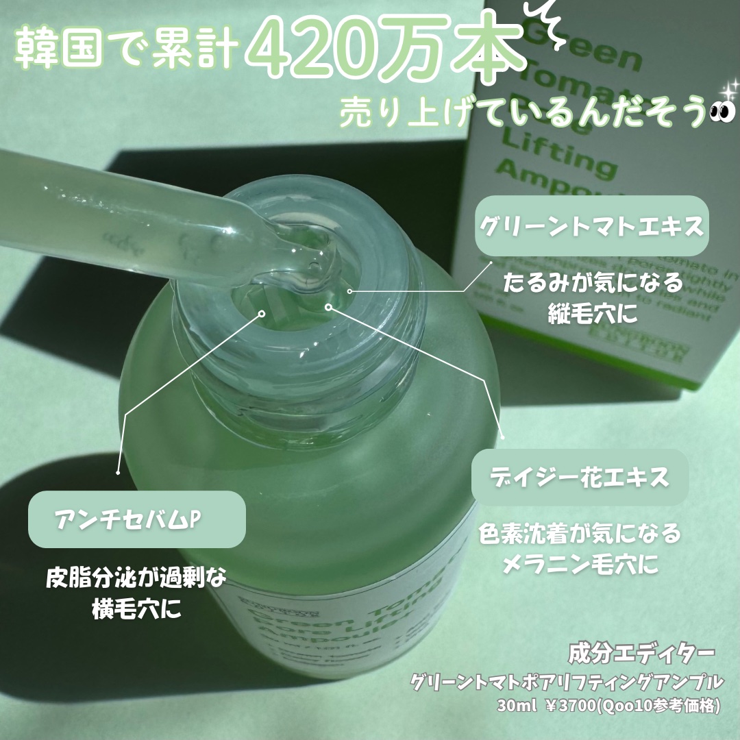 成分エディターグリーントマトポアリフティングアンプル縦毛穴、横毛穴、メラニン毛穴の気になる3種の毛穴にアプローチ!毛穴が気になっている方におすすめなアンプル😊低刺激テスト済みで朝も夜も使用可能!とろみがあるテクスチャーのアンプルを満べんなく塗...