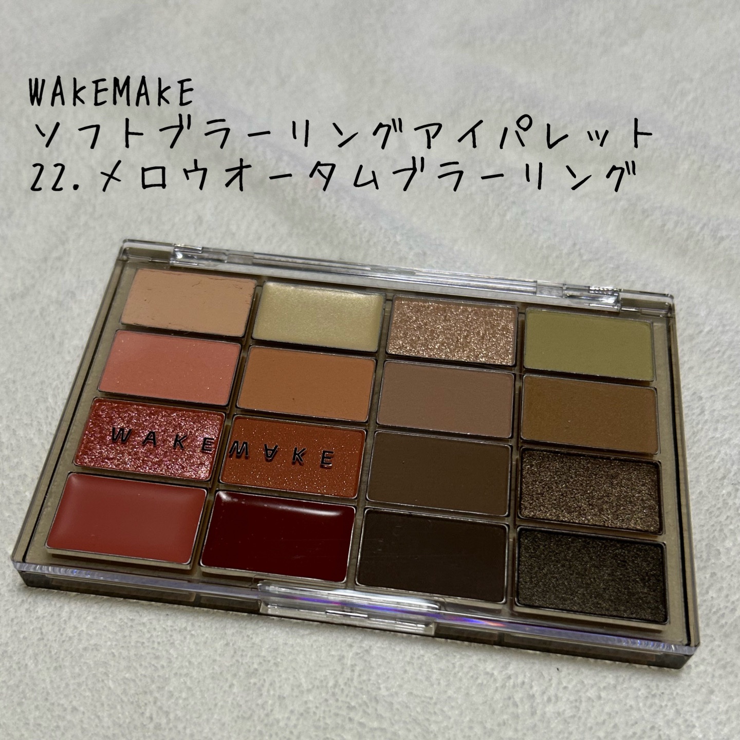 WAKEMAKEのソフトブラーリングアイパレットは、マット・パール・グリッターなど質感の異なる全16色のカラーが入ったアイパレット✨ 22 メロウオータムブラーリングのカラーは、深みのあるカラーにアクセントのあるスモーキーカーキ、暖かみのあるゴールディッシュイエローを感じるディープブラウン&スモーキーメイクルックだそうです🫠🌟 服や気分に合わせて色んなメイクができるのでおすすめです❣️