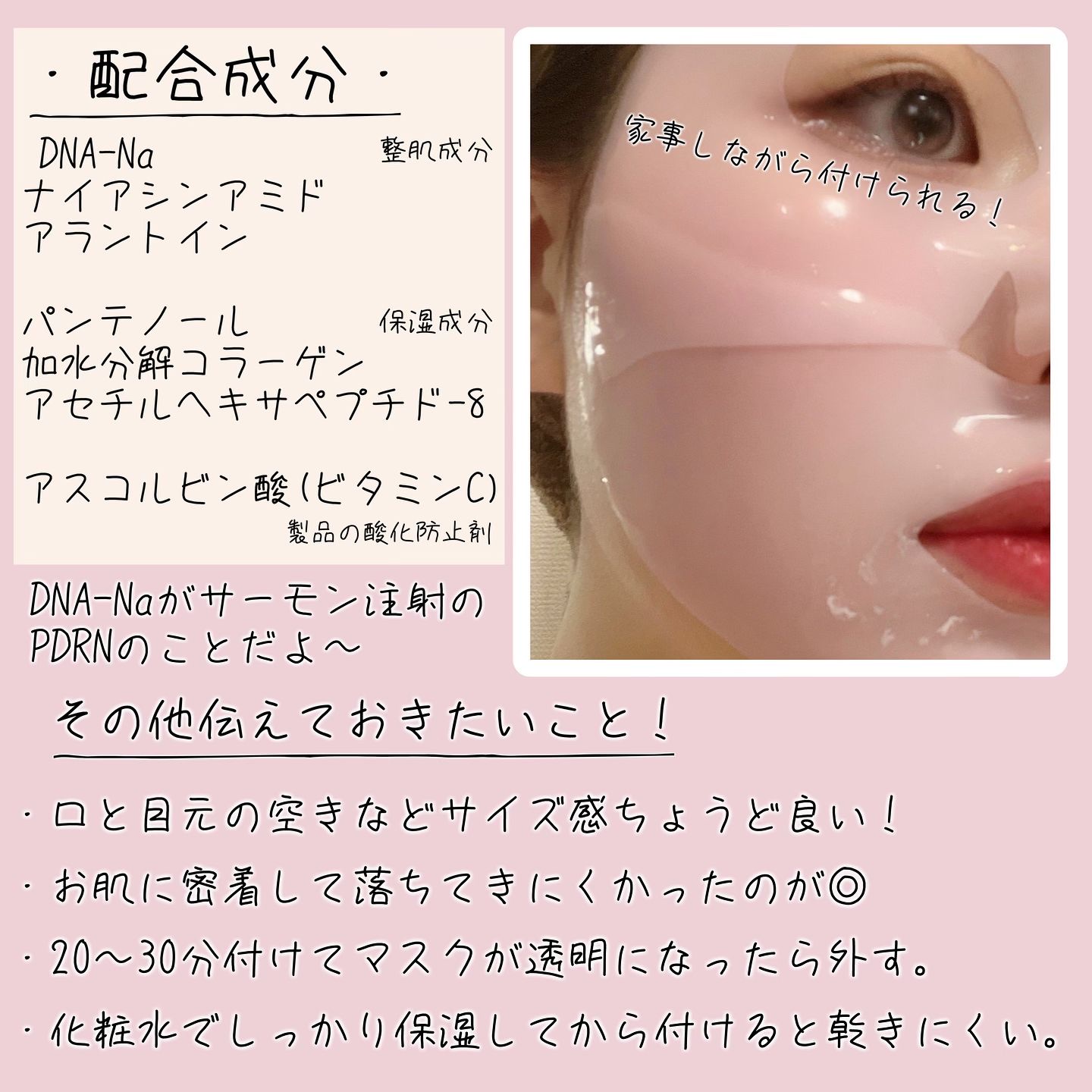 肌が揺らぐ季節の若返りサーモン注射 メガ割でもバズりまくって配送遅延が出てたみたい.ᐟ🥹 大人気商品ですっ💗 塗るサーモン注射💉話題のPDRN! シミ・ニキビ跡をうすめる色素沈着トーニング効果で綺麗で明るい肌に✨️ ぷるっとしたマスクはお肌にしっかりと密着してくれるよ!2-3時間ほど吸収させるとマスクがどんどん透明に✨️