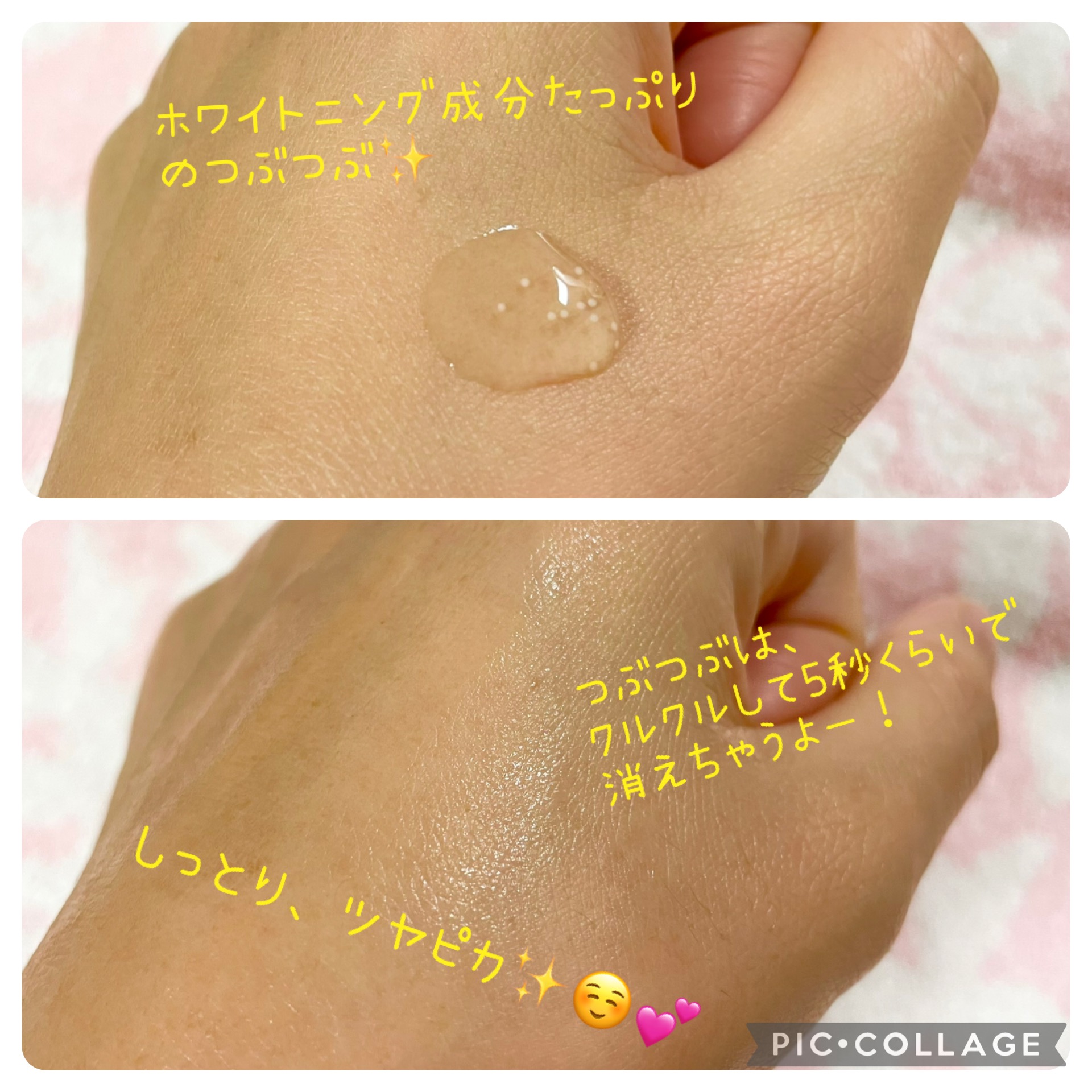 粒々の入った美容液は初めてだったので、使うまでちょっとドキドキ。。 この粒々がホワイトニング効果の秘訣みたい。 潤い過ぎて、ごくごくお肌が飲んでるみたい! 潤いやばいのにベタつき少ない。 お肌つるっつるして気持ちいい。。 ベタつき少ないからすぐメイクしても大丈夫だし、毛穴の黒ずみにも効果あるみたいなので、しばらく使い続けてみようと思います( *´艸`)
