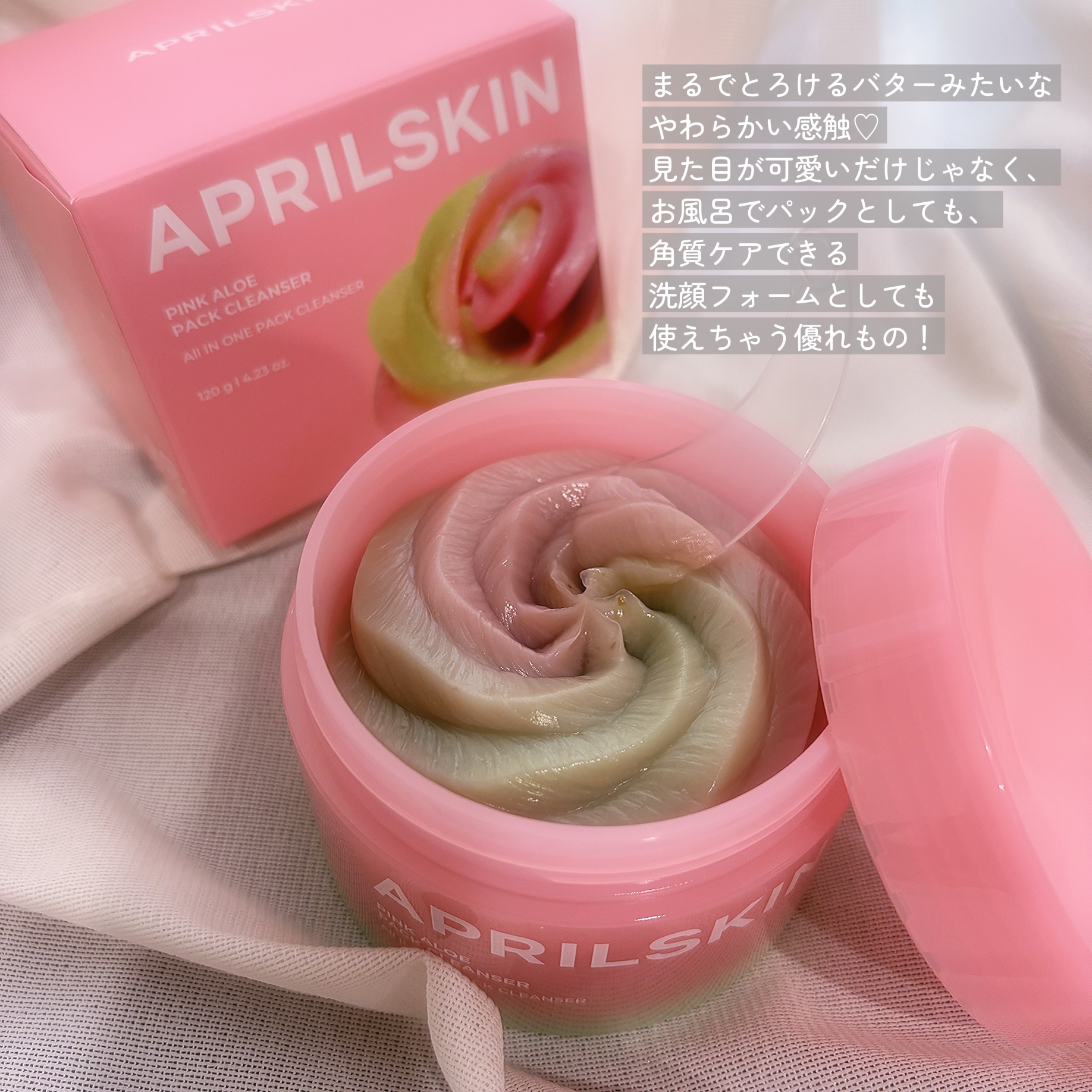 ピンクとアロエ色、またホイップしたような見た目がとっても可愛いです。 テクスチャーはふわふわしっとりなめらか。なめらかに伸びて、優しくなじませることが出来ます。 肌が食べる新感覚メレンゲクレンザー! やわらかい濃度で埋め尽くし、毛穴の隙間まで完璧に皮脂・老廃物・黒ずみを吸着。 保湿成分と自然クーリンク成分で使用後の毛穴引き締めまで。