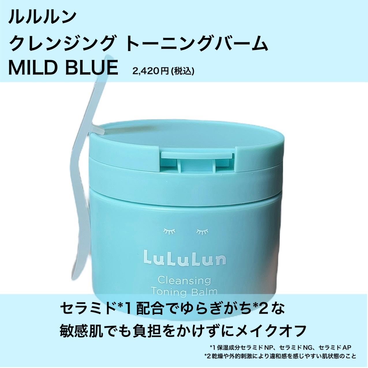 ルルルンクレンジング トーニングバーム MILD BLUE セラミド*¹配合の柔らかいバームでマイルドに落として敏感なお肌を健やかに導きます😊✨ 肌荒れケア成分も配合されているのでちゅるんと素肌に整えてくれるそう👍🏻✨ 乳化のスピードも早くて短時間でしっかりとクレンジングができるのも嬉しいポイント🌟