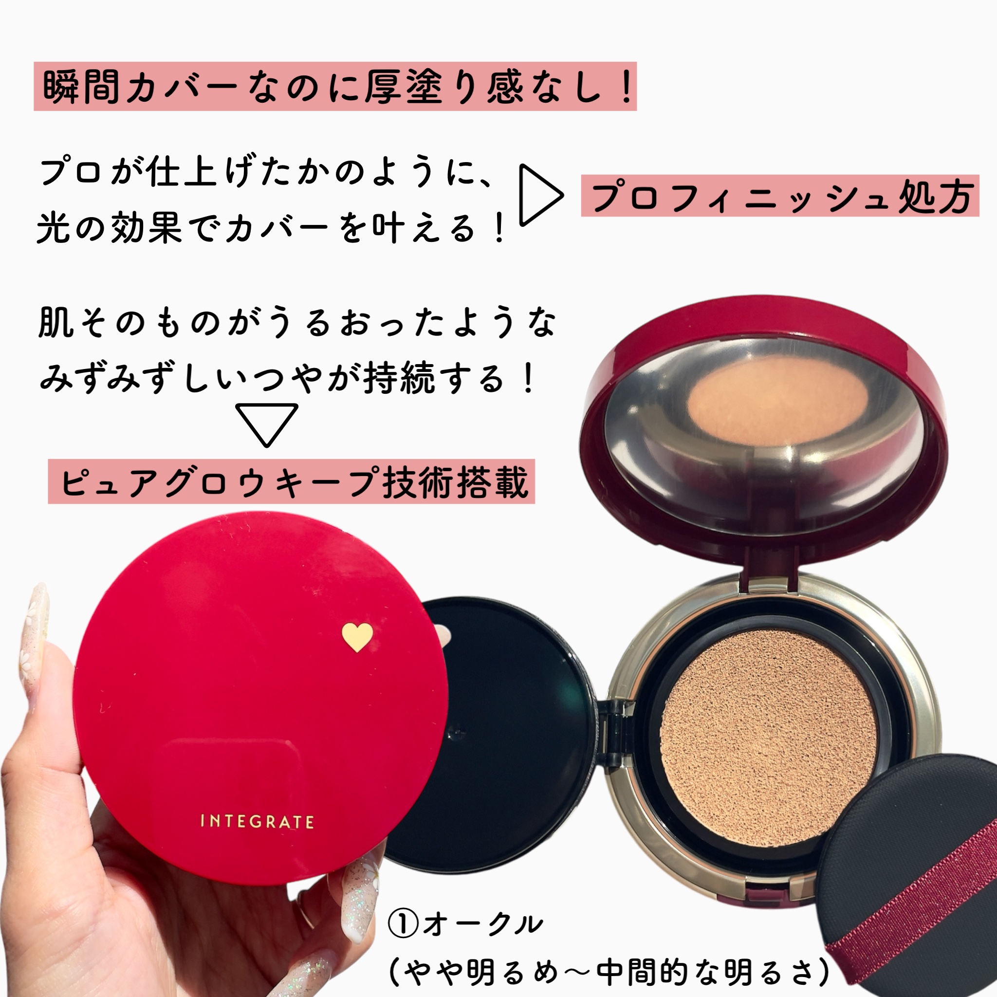 クッションファンデはとにかくハイカバーでツヤ肌🫧 シミや赤み、毛穴も隠してくれて使いやすい! 下地「うるピュアベース」は少し使いにくいかも… ラベンダーのコントロールカラーなので、色むらやくすみは飛ばしてくれるので部分使いには良いかも知れません。 特にお勧めするのは「プロフィニッシュクッション」 なのでぜひ新しいクッションファンデお探しの方は手にとってみて下さいね✨