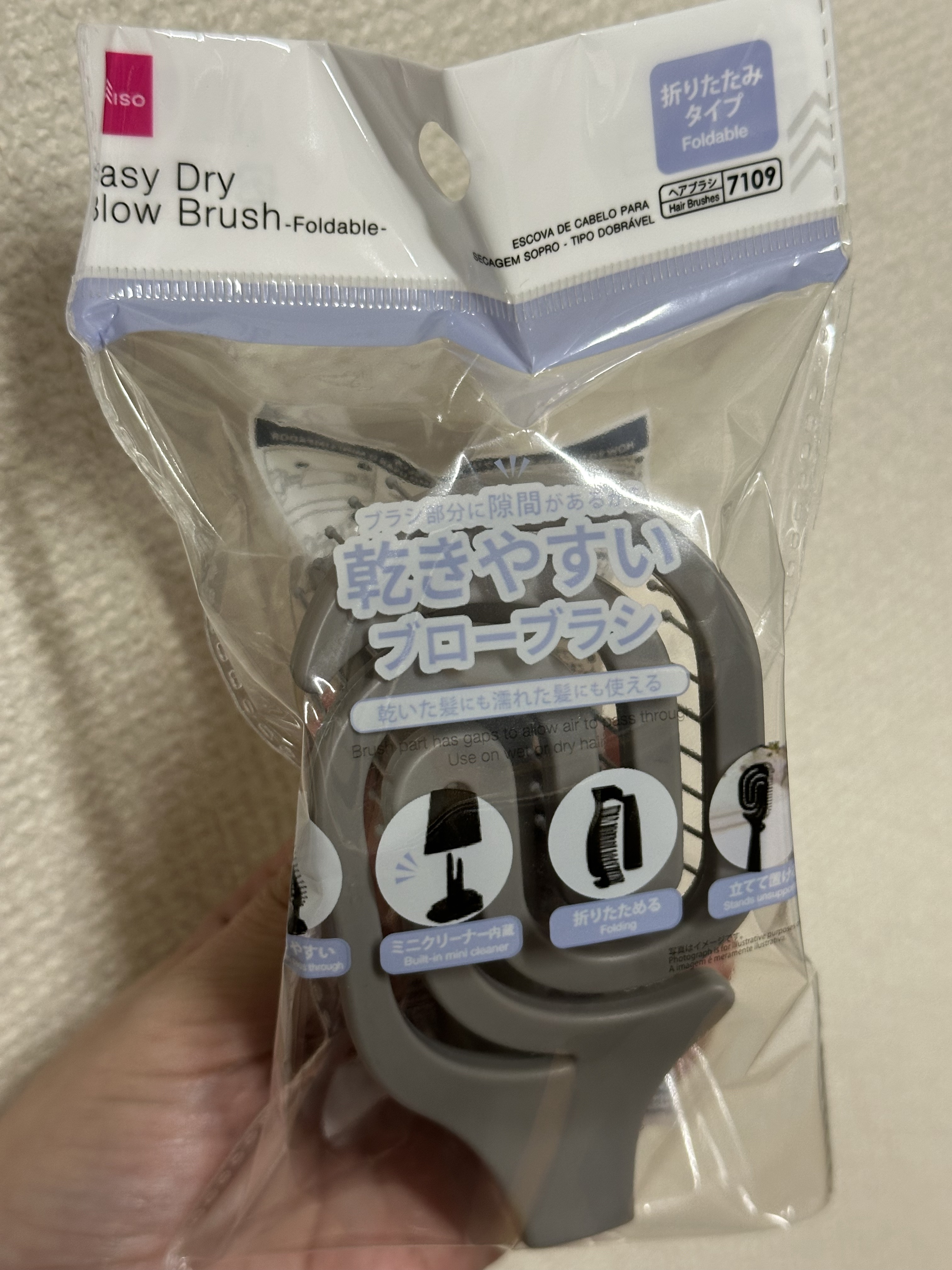 待望の折りたたみが再入荷嬉しすぎる…!!!! DAISOのヘアブラシ部門も強いですね🧘🏻🤍🤍 このブローブラシは折りたたみじゃない大小もあってお家では大きいものを使って今まで持ち運びは折りたたみじゃない方の小さいのを使ってたの! たまたま出会えて嬉しすぎ💗 実はチェゴシム探しに行ったんだけどブラシの方に出会ったよ笑