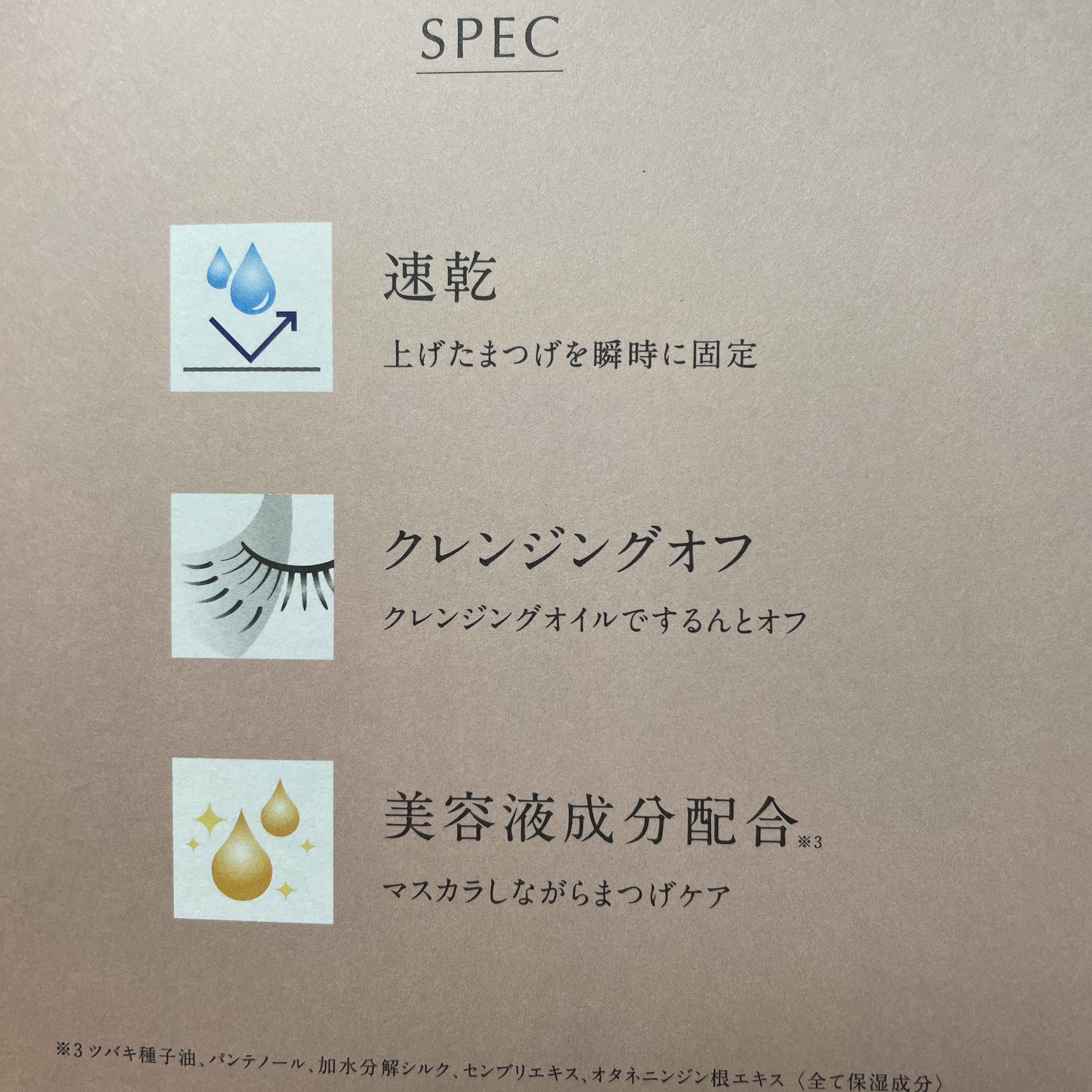- <ブラック> イソドデカン、トリメチルシロキシケイ酸、パルミチン酸デキストリン、マイクロクリスタリンワックス、タルク、水添ポリデセン、ジメチコン、ジステアルジモニウムヘクトライト、ジフェニルシロキシフェニルトリメチコン、ミツロウ、ナイロンー12、カルナウバロウ、ナイロンー6、リンゴ酸ジイソステアリル、炭酸プロピレン、水添(スチレン/イソプレン)コポリマー、ジステアリン酸Al、フェノキシエタノール、ポリソルベート85、シリカ、トコフェロール、水、ツバキ種子油、パンテノール、BG、エタノール、加水分解シルク、センブリエキス、オタネニンジン根エキス、酸化鉄、カーボンブラック