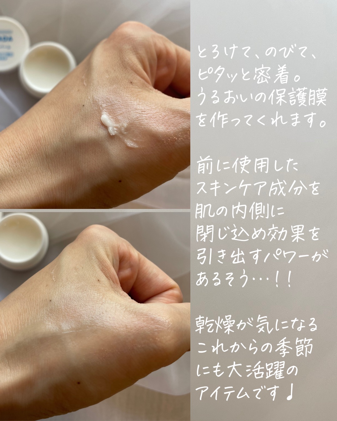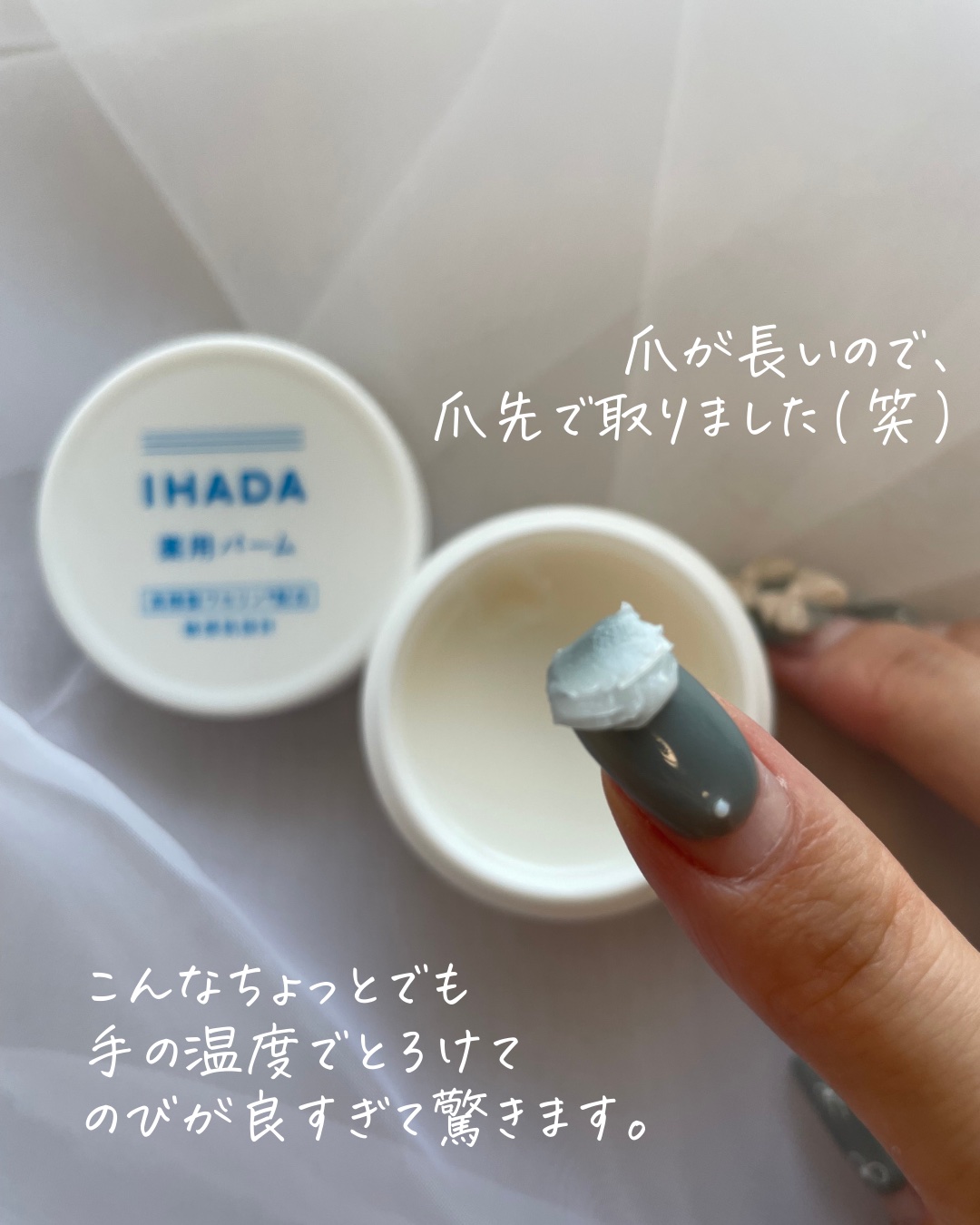 うるおい密閉してくれるIHADAの薬用バーム! とにかく低刺激で使いやすいです。 高精製ワセリン配合で乾燥などの外部刺激から守ってくれる 少量でとろけるように伸びてくれるバームでワセリン配合なのですが、べたつかずにしっかりと保湿してくれるのがお気に入りです!