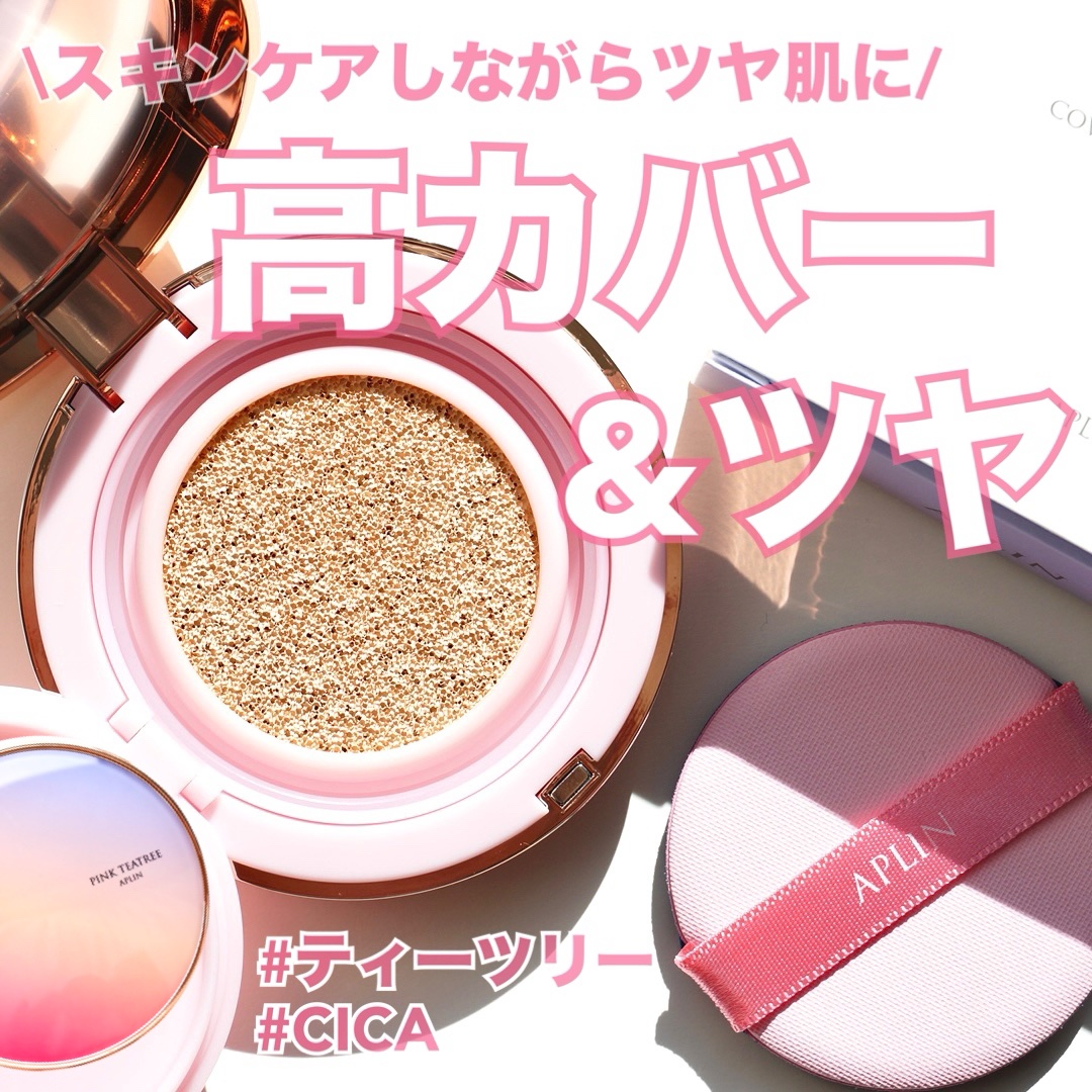 APLIN ピンクティーツリーカバークッション 21号ライトベージュ 2,490円(税込) 少量でよく伸びてハイカバー! 赤みやくすみをしっかりカバ一できるのに、厚塗り感のないなめらかな仕上がり♡ ハイカバーなのにナチュラルなツヤ感とサラッとしつつ、乾燥崩れしにくい仕上がりに感動します!!
