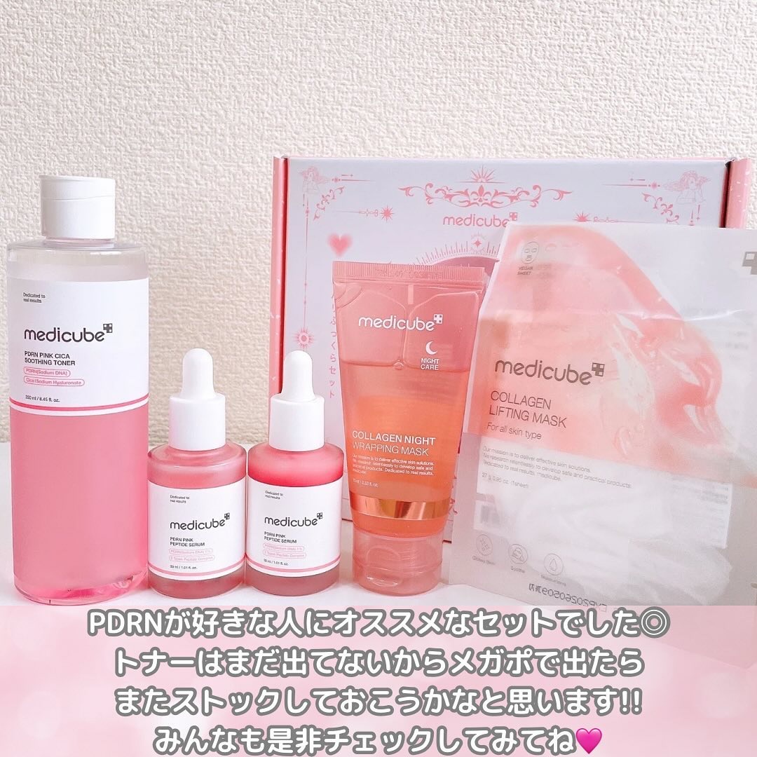 毎回ワクワク感が止まらないメディキューブさん‼︎ 今回も全セット購入しました🤗 青い箱毛穴ごっそりセット このセットは全て愛用してる商品が入っててパットはもう何十個使ったかわからないほど大好きなやつ🩵 1番楽しみにしてたやつ🩷🩷 今大注目のPDRNのアンプルが二つも入ってて新作のPDRNのトナーも!!