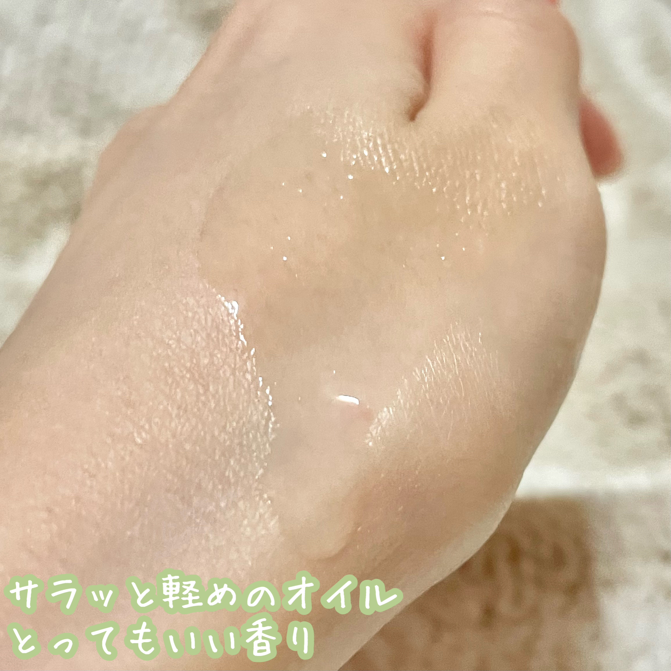 乾いた髪にもタオルドライした髪にも使える🙆♀️✨ 朝摘み果実とウォーターブロッサムを感じさせる香り 甘めの香りで好き💗 保湿成分のヤシ油、酢酸トコフェロール配合 少しとろみのあるオイルで髪に密着! つけた時はしっとり ドライヤー後はふわさら仕上がりでべたつかない🥰