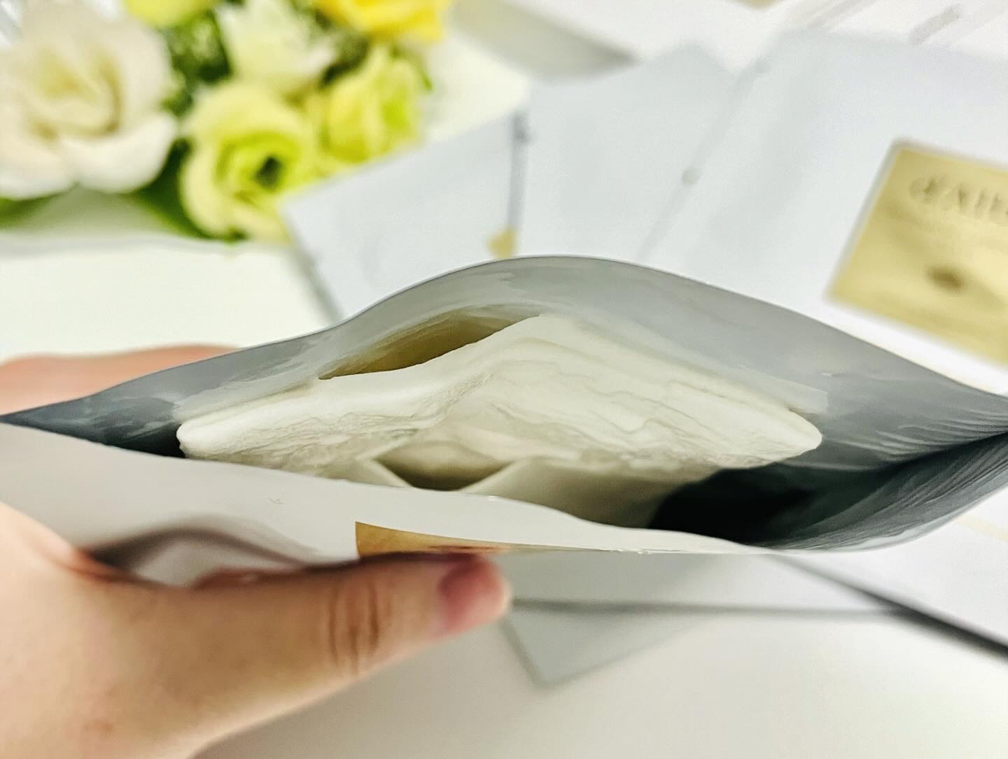 - <1枚> 水、グリセリン、メチルプロパンジオール、BG、トリ(カプリル酸/カプリン酸)グリセリル、ナイアシンアミド、ベタイン、ステアリン酸ポリグリセリル-6、ヒドロキシアセトフェノン、オリーブ油脂肪酸セテアリル、パンテノール、オリーブ油脂肪酸ソルビタン、(アクリレーツ/アクリル酸アルキル(C10-30))クロスポリマー、(アクリル酸ヒドロキシエチル/アクリロイルジメチルタウリンNa)コポリマー、アラントイン、カフェイン、トロメタミン、カプリリルグリコール、1,2-ヘキサンジオール、ベヘン酸ポリグリセリル-6、エチルヘキシルグリセリン、アデノシン、シリカ、香料、キサンタンガム、ポリアクリル酸Na、ツベルマグナツムエキス、ペンチレングリコール、イソステアリン酸ソルビタン、EDTA-2Na、アセチルグルコサミン、ヒアルロン酸Na、メリアアザジラクタ花エキス、リモネン、カミメボウキ葉エキス、デキストリン、カカオエキス、リナロール、メリアアザジラクタ葉エキス、ヘキシルシンナマル、フナバラソウエキス、ウコン根エキス、サンゴモエキス、ヒアルロン酸クロスポリマーNa、タチアオイ花エキス、グルコース、マンノース、ツバキ種子油、ヒマワリ種子油、月見草油、オリーブ果実油、アボカド油、ダイズ油、マカデミア種子油、コラーゲンエキス、セラミドNP、水添ポリイソブテン、異性化糖、キシリチルグルコシド、無水キシリトール、トコフェロール、キシリトール、ヒポファエラムノイデス果実油、クエン酸、クエン酸Na、ツボクサエキス、ツボクサ葉エキス、ツボクサ根エキス、ヒアルロン酸ヒドロキシプロピルトリモニウム、ハナスゲ根エキス、ニゲラサチバ種子油、加水分解ヒアルロン酸、アセチルヒアルロン酸Na、マデカッソシド、アシアチコシド、アシアチン酸、ヒアルロン酸、マデカシン酸、加水分解ヒアルロン酸Na、ヒアルロン酸K <4枚> 水、グリセリン、メチルプロパンジオール、BG、トリ(カプリル酸/カプリン酸)グリセリル、ナイアシンアミド、ベタイン、ステアリン酸ポリグリセリル-6、ヒドロキシアセトフェノン、オリーブ油脂肪酸セテアリル、パンテノール、オリーブ油脂肪酸ソルビタン、(アクリレーツ/アクリル酸アルキル(C10-30))クロスポリマー、(アクリル酸ヒドロキシエチル/アクリロイルジメチルタウリンNa)コポリマー、アラントイン、カフェイン、トロメタミン、カプリリルグリコール、1,2-ヘキサンジオール、ベヘン酸ポリグリセリル-6、エチルヘキシルグリセリン、アデノシン、シリカ、香料、キサンタンガム、ポリアクリル酸Na、ツベルマグナツムエキス、ペンチレングリコール、イソステアリン酸ソルビタン、EDTA-2Na、アセチルグルコサミン、ヒアルロン酸Na、メリアアザジラクタ花エキス、リモネン、カミメボウキ葉エキス、デキストリン、カカオエキス、リナロール、メリアアザジラクタ葉エキス、ヘキシルシンナマル、フナバラソウエキス、ウコン根エキス、サンゴモエキス、ヒアルロン酸クロスポリマーNa、タチアオイ花エキス、グルコース、マンノース、ツバキ種子油、ヒマワリ種子油、月見草油、オリーブ果実油、アボカド油、ダイズ油、マカデミア種子油、コラーゲンエキス、セラミドNP、水添ポリイソブテン、異性化糖、キシリチルグルコシド、無水キシリトール、トコフェロール、キシリトール、ヒポファエラムノイデス果実油、クエン酸、クエン酸Na、ツボクサエキス、ツボクサ葉エキス、ツボクサ根エキス、ヒアルロン酸ヒドロキシプロピルトリモニウム、ハナスゲ根エキス、ニゲラサチバ種子油、加水分解ヒアルロン酸、アセチルヒアルロン酸Na、マデカッソシド、アシアチコシド、アシアチン酸、ヒアルロン酸、マデカシン酸、加水分解ヒアルロン酸Na、ヒアルロン酸K