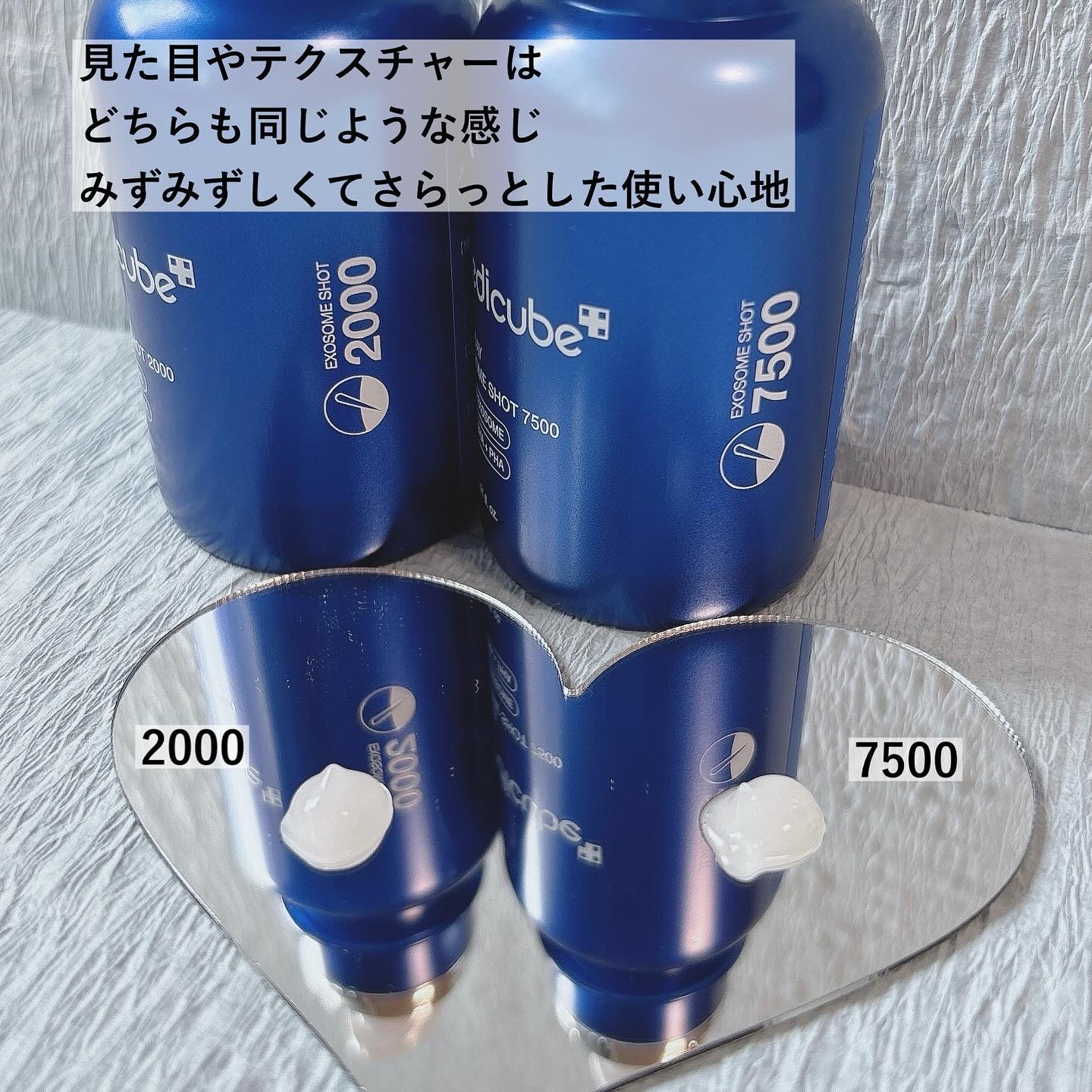 2000と7500、どちらもジェルのようなみずみずしいテクスチャー。 数字の大きさに恐る恐る使ってみたのですが、意外とチクチク感は強くないと思いました。 毛穴よりも13倍小さい16μmというサイズで、エステ専門ケア並みの効果が得られるそう。 水分クリームと一緒に使っているのですが、肌がもちっとして相性がいいみたいです。