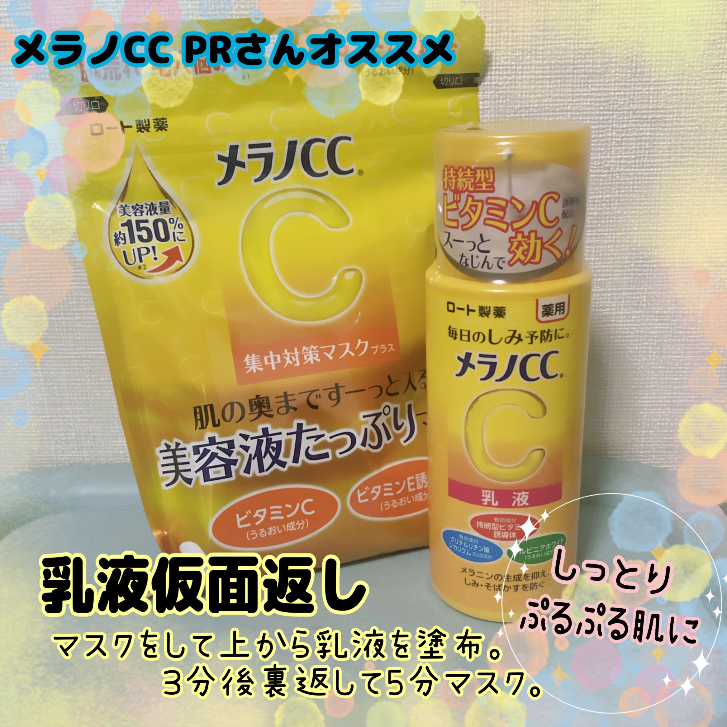 ロート製薬様から頂きました♪メラノCCメラノCC集中対策マスクプラスビタミンC※1※2、ビタミンE誘導体※1※3配合の分厚い密着マスク。※1:うるおい成分※2:アスコルビン酸※3:酢酸トコフェロール厚みのあるしっかりとしたシート!サイズ感はち...