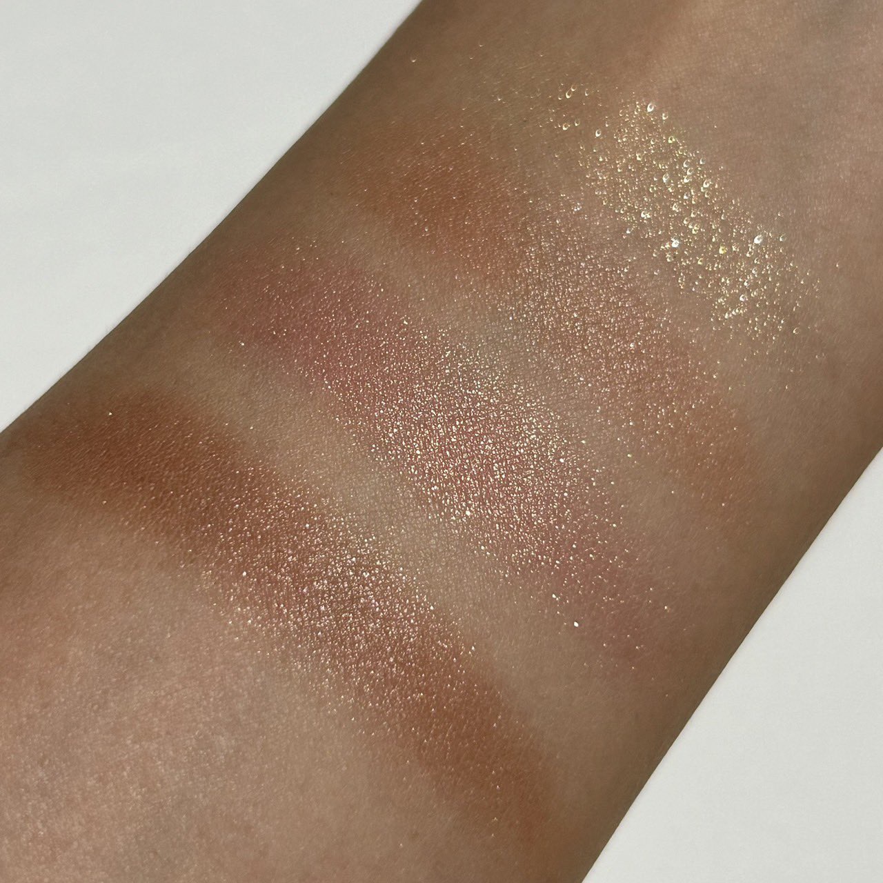 mude.の方がよりあたたかみのある印象で全体的に使いやすい色味が入っている感じ◎ ラメ感もギラギラするよりかは上品なキラキラ感✨ rom&ndはmude.に比べるとフレッシュな印象!春や夏に使うと映えそう❣️ ラメ感も強く、目立つかな。 似てるかもしれないからと買うのを長い間悩んでいましたが、仕上がりが全然変わってくるので、買って良かった😂❤️ 粉質はブランドも違うので違ったよ✨ rom&ndの方がしっとり感があって強く発色する感じ。 mude.は淡い発色で、初心者さんも使いやすいと思った🫶🏻