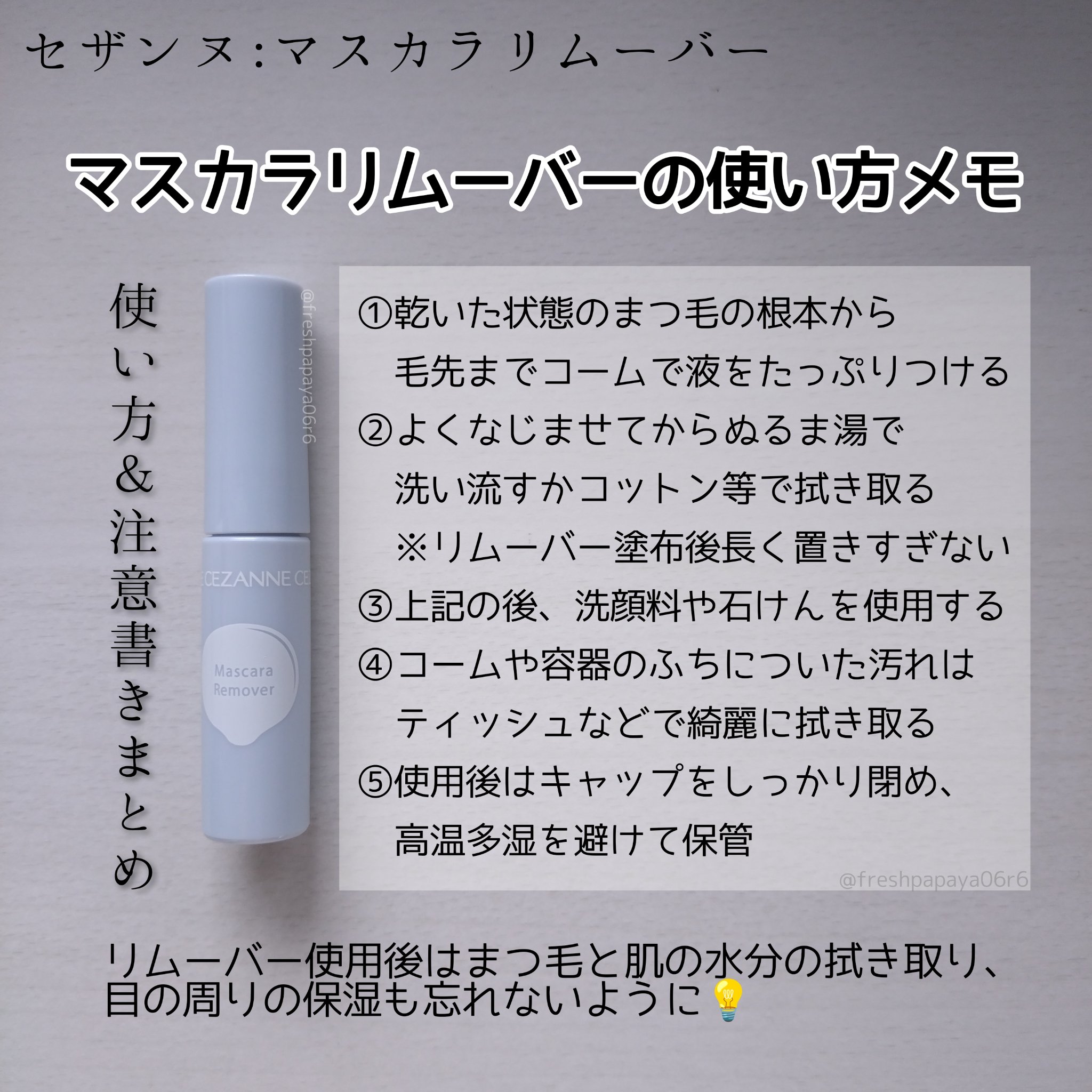 - まつ毛に素早く馴染んで、頑固なウォータープルーフマスカラもするんと落とせます。 セザンヌのウォータープルーフマスカラとフィルムタイプ(お湯オフタイプ)のマスカラ全てに使用できます。 目元のことを考えた液だれしにくい処方。 美容液成分7種(ユズ果実エキス、パンテノール、ビオチノイルトリペプチド-1、ウメ果実エキス、ラウロイルグルタミン酸ジ(フィトステリル/オクチルドデシル)、アカヤジオウ根エキス、トウキンセンカ花エキス)配合。 まつ毛にたっぷり塗れる幅広コームを採用。