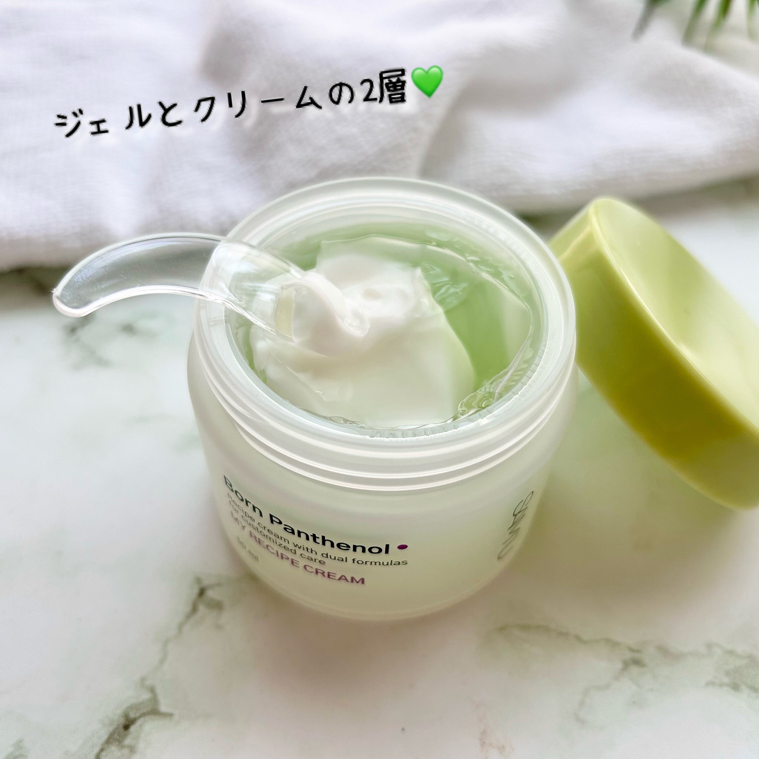 BORN PANTHENOL MY RECIPE CREAM なんとウォータージェル層とパンテノールクリーム層の2種類になっているので肌の状態に合わせてクリームをミックスして、カスタマイズケアができるクリームなんです✨ 水分チャージ、保湿、鎮静が1度にケアできる3in1タイプ。べたつきもなくしっとりとうるおうので季節問わず使うことができます! 自分のお肌のコンディションにあわせて使えるのでケアしやすいです😊