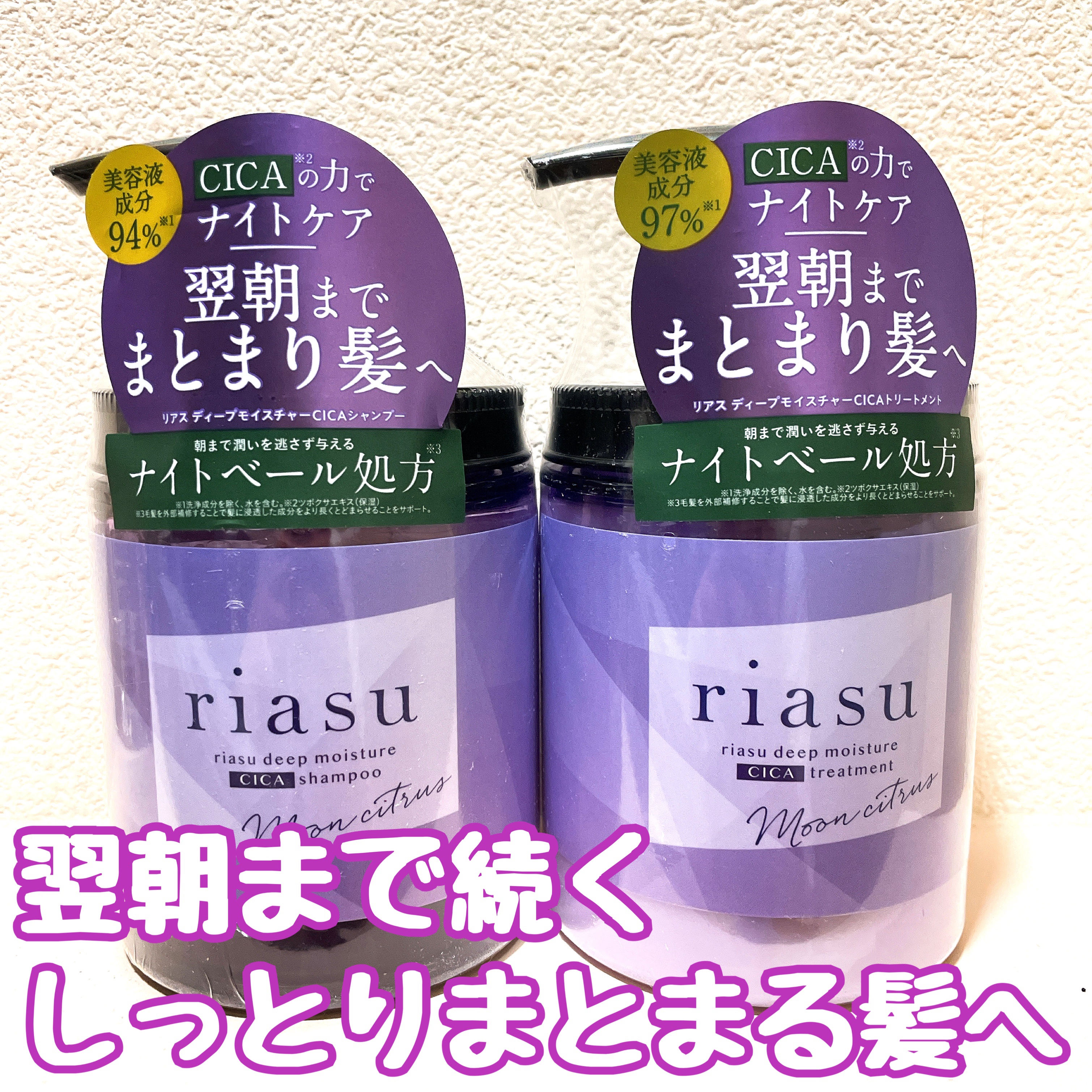 riasudeepmoistureCICAshampoo/treatment プレゼントキャンペーンで提供頂きました。ムーンシトラスの香りはラベンダー、ティーツリーなど安らかで上品な香りがいい🌙𖤐⡱泡立ちもよく、きしまず洗えるよ!翌朝起きた...