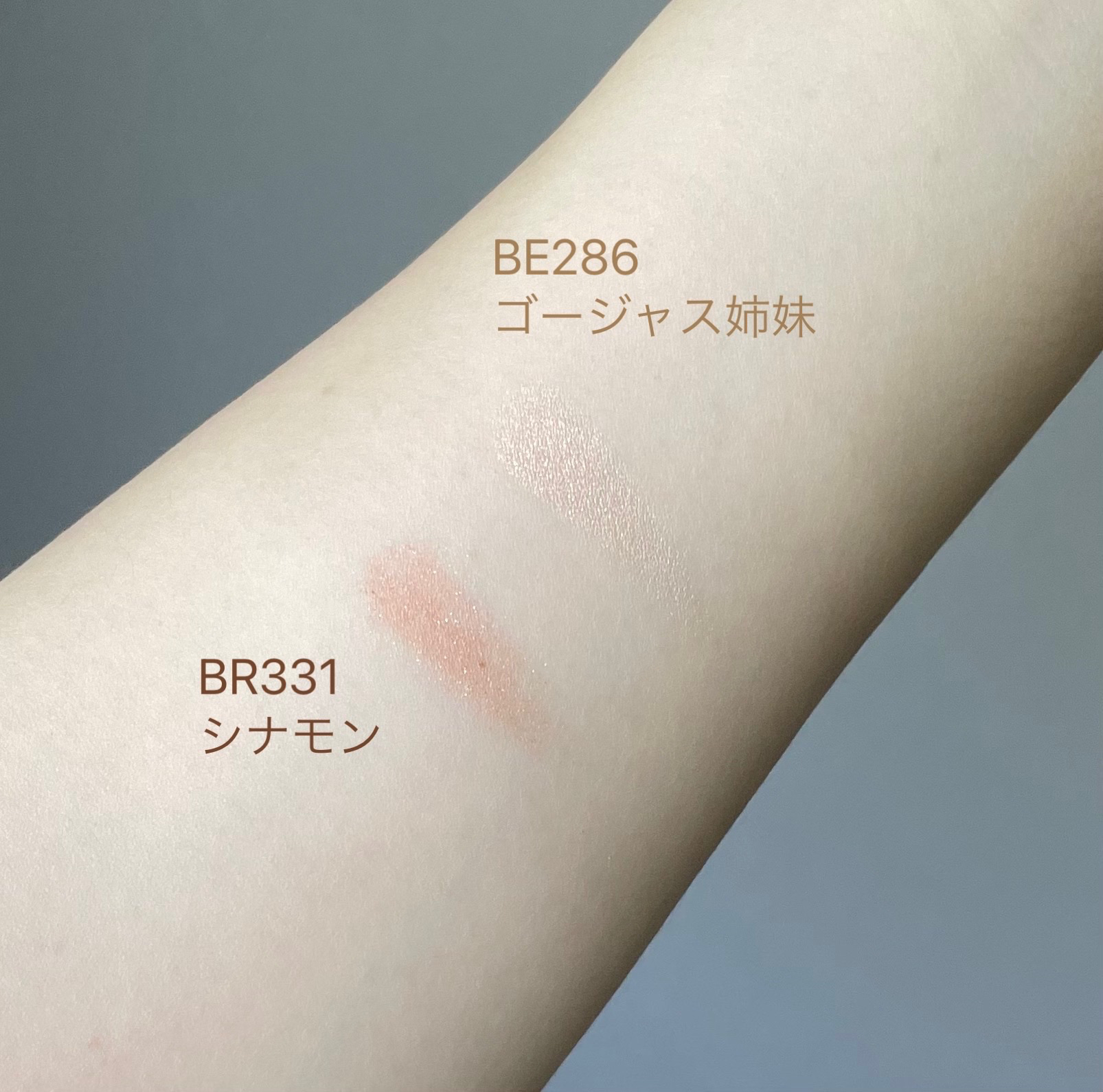 - <BE121 恋の達人> タルク、ワセリン、ジメチコン、セスキイソステアリン酸ソルビタン、ポリメタクリル酸メチル、ミネラルオイル、テトラヒドロテトラメチルシクロテトラシロキサン、テトラデセン、トコフェロール、エチルパラベン、(+/-)マイカ、酸化チタン、酸化鉄、合成金雲母、赤226、黄401、青404 <BE203 綿菓子> タルク、リンゴ酸ジイソステアリル、焼成セリサイト、トリエチルヘキサノイン、ワセリン、セスキイソステアリン酸ソルビタン、酸化亜鉛、ミリスチン酸亜鉛、エチルヘキシルグリセリン、ハイドロゲンジメチコン、酸化スズ、トリエトキシカプリリルシラン、トコフェロール、水酸化Al、テトラヒドロテトラメチルシクロテトラシロキサン、テトラデセン、クロルフェネシン、マイカ、合成金雲母、酸化チタン、酸化鉄 <BE286 ゴージャス姉妹> タルク、リンゴ酸ジイソステアリル、トリオクタノイン、セスキイソステアリン酸ソルビタン、ミリスチン酸亜鉛、シリカ、トコフェロール、テトラヒドロテトラメチルシクロテトラシロキサン、テトラデセン、エチルパラベン、マイカ、酸化チタン、酸化鉄、グンジョウ、酸化亜鉛、赤226 <BE330 マサラチャイ> タルク、リンゴ酸ジイソステアリル、メタクリル酸メチルクロスポリマー、トリエチルヘキサノイン、ワセリン、ミリスチン酸亜鉛、酸化亜鉛、セスキイソステアリン酸ソルビタン、エチルヘキシルグリセリン、アルミナ、酸化スズ、トコフェロール、テトラヒドロテトラメチルシクロテトラシロキサン、テトラデセン、クロルフェネシン、マイカ、酸化チタン、酸化鉄、合成金雲母、グンジョウ、赤226 <BE384 コルク> タルク、ワセリン、トリエチルヘキサノイン、ジメチコン、酸化亜鉛、セスキイソステアリン酸ソルビタン、メタクリル酸メチルクロスポリマー、ミリスチン酸亜鉛、エチルヘキシルグリセリン、酸化スズ、トリエトキシカプリリルシラン、トコフェロール、クロルフェネシン、マイカ、酸化鉄、酸化チタン、合成金雲母、グンジョウ <BK922 黒蜥蜴> タルク、リンゴ酸ジイソステアリル、トリエチルヘキサノイン、ワセリン、酸化亜鉛、セスキイソステアリン酸ソルビタン、ミリスチン酸亜鉛、エチルヘキシルグリセリン、テトラヒドロテトラメチルシクロテトラシロキサン、テトラデセン、トコフェロール、クロルフェネシン、マイカ、酸化鉄、合成金雲母、酸化チタン、コンジョウ、グンジョウ <BR331 シナモン> タルク、リンゴ酸ジイソステアリル、メタクリル酸メチルクロスポリマー、トリエチルヘキサノイン、ワセリン、セスキイソステアリン酸ソルビタン、酸化亜鉛、ミリスチン酸亜鉛、エチルヘキシルグリセリン、酸化スズ、テトラヒドロテトラメチルシクロテトラシロキサン、トコフェロール、テトラデセン、クロルフェネシン、マイカ、酸化鉄、合成金雲母、酸化チタン <BR332 胡桃> タルク、リンゴ酸ジイソステアリル、メタクリル酸メチルクロスポリマー、トリエチルヘキサノイン、ワセリン、酸化亜鉛、ミリスチン酸亜鉛、セスキイソステアリン酸ソルビタン、エチルヘキシルグリセリン、酸化スズ、トコフェロール、テトラヒドロテトラメチルシクロテトラシロキサン、テトラデセン、ヒドロキシプロピルセルロース、クロルフェネシン、マイカ、酸化チタン、酸化鉄、合成金雲母、コンジョウ <BR583 テディ> タルク、ワセリン、トリエチルヘキサノイン、シリカ、ジメチコン、酸化亜鉛、セスキイソステアリン酸ソルビタン、ミリスチン酸亜鉛、エチルヘキシルグリセリン、トリエトキシカプリリルシラン、酸化スズ、トコフェロール、クロルフェネシン、マイカ、酸化鉄、合成金雲母、グンジョウ、酸化チタン <BR703 コナ> タルク、リンゴ酸ジイソステアリル、焼成セリサイト、トリエチルヘキサノイン、ワセリン、ミリスチン酸亜鉛、酸化亜鉛、セスキイソステアリン酸ソルビタン、エチルヘキシルグリセリン、ハイドロゲンジメチコン、トリエトキシカプリリルシラン、酸化スズ、トコフェロール、クロルフェネシン、マイカ、合成金雲母、酸化鉄、酸化チタン、グンジョウ <GD822 ゴールデン> タルク、リンゴ酸ジイソステアリル、トリオクタノイン、セスキイソステアリン酸ソルビタン、トコフェロール、テトラヒドロテトラメチルシクロテトラシロキサン、テトラデセン、エチルパラベン、(+/-)マイカ、酸化鉄、酸化チタン、合成金雲母 <OR300 みちしるべ> タルク、リンゴ酸ジイソステアリル、メタクリル酸メチルクロスポリマー、トリエチルヘキサノイン、ワセリン、酸化亜鉛、ミリスチン酸亜鉛、セスキイソステアリン酸ソルビタン、エチルヘキシルグリセリン、ジメチコン、ハイドロゲンジメチコン、酸化スズ、トコフェロール、テトラヒドロテトラメチルシクロテトラシロキサン、ヒドロキシプロピルセルロース、テトラデセン、クロルフェネシン、マイカ、酸化チタン、酸化鉄、合成金雲母、黄4 <OR481 マリー> タルク、ワ
