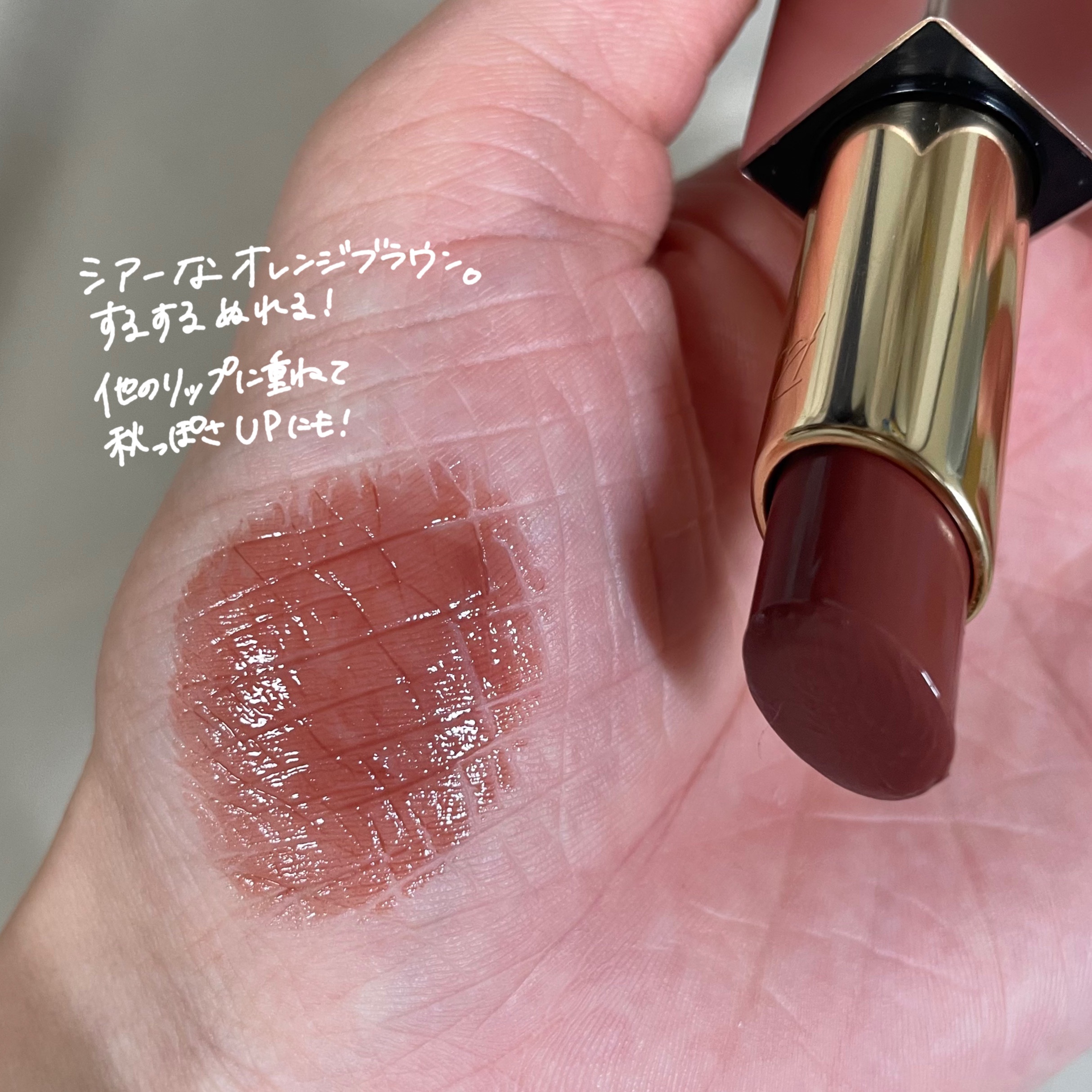 くすみのないシアーなオレンジレッドです🍊 スティックだと色が濃く見えますが、透け感のあるカラーなので重ね方によって発色が調節できてどんな使いやすいです👍🏻 するする塗れて、乾燥も気にならず、潤いが長持ちします🪄 公式サイトによると4種のセラミド*とアルガンオイル*2を配合だからだそうそうです! 色展開も12色と豊富なので春ビビさん以外の方も似合うカラーが見つかるはずです🎀