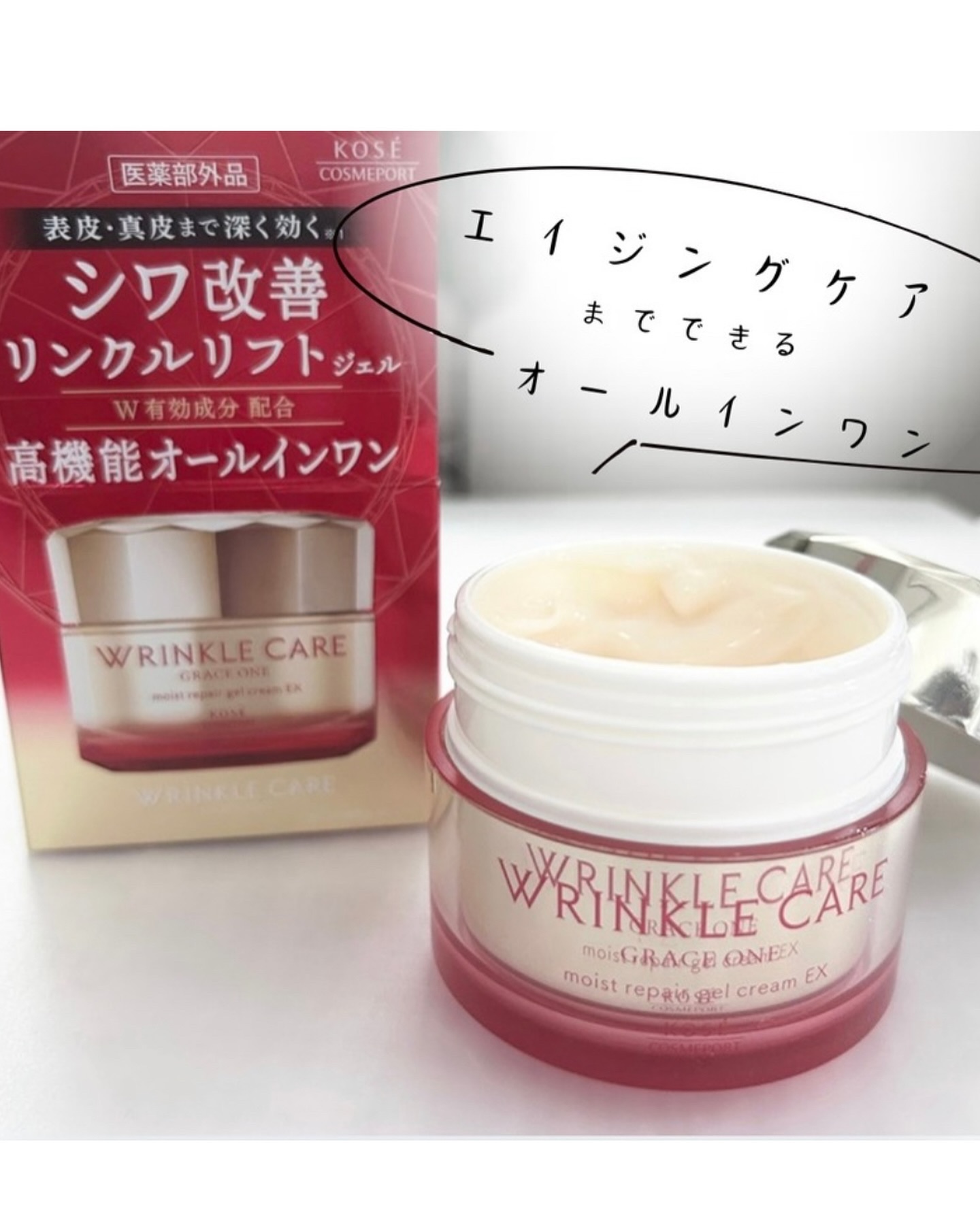 - 販売名:グレイス ワン リンクルケア モイストリペア ジェルクリーム EX 1品7役、シワを改善する高機能オールインワンジェル。 W有効成分配合。高機能モイストリフト成分配合。 こくのあるジェルクリームで肌(角層)のうるおい低下を防ぎながらシワ悩みをケアします。