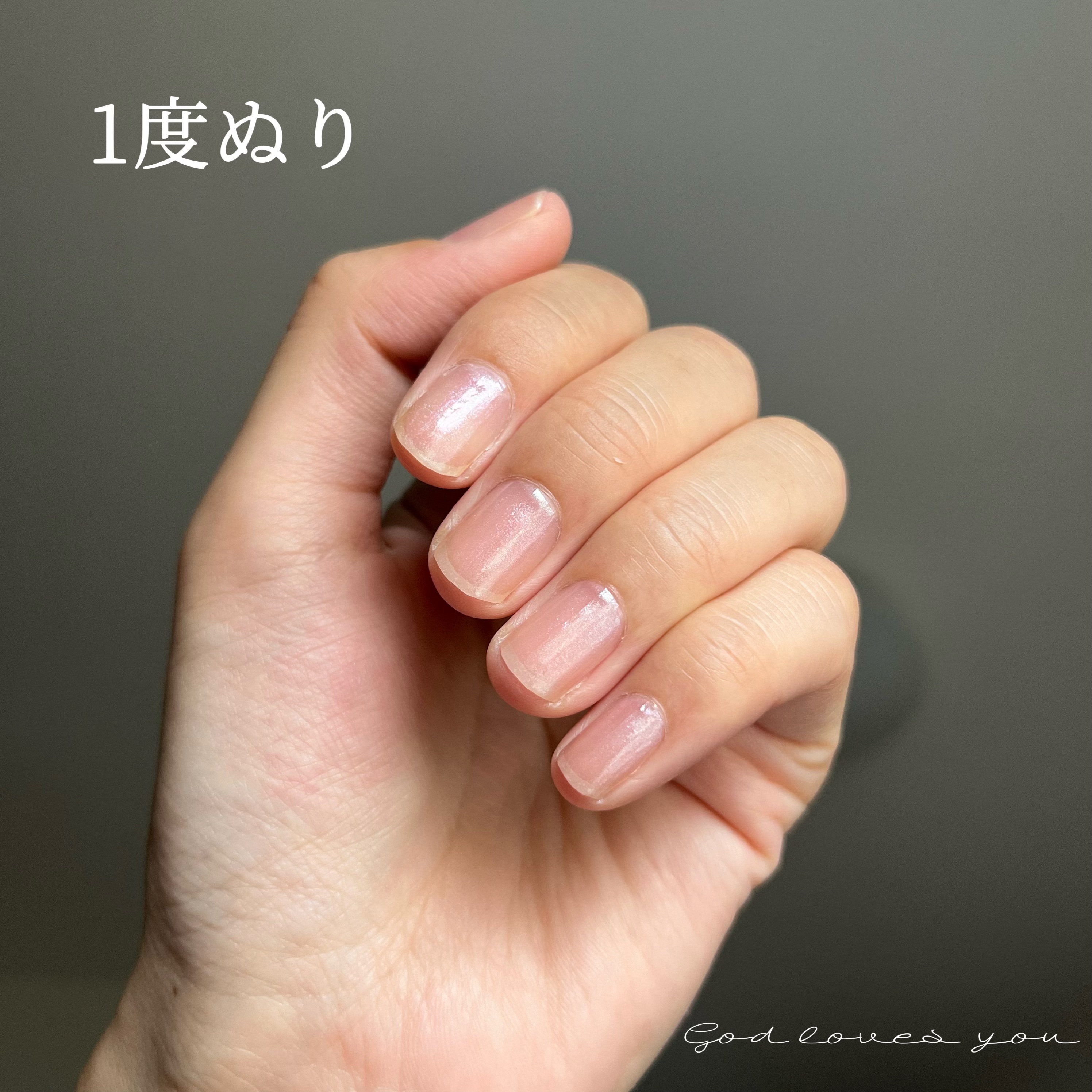 これ一本で ベースコート・ネイルカラー・うるおいケア・トップコート の4機能を兼ねているオールインワンネイル。 ご提供いただいた#24メロウマーメイド は、少しパープルの色が入った上品なピンク色。 2~3回重ね塗るをすると、より厚みのあるジェルのようなツヤが楽しめるという事なので、3回塗ってみました。