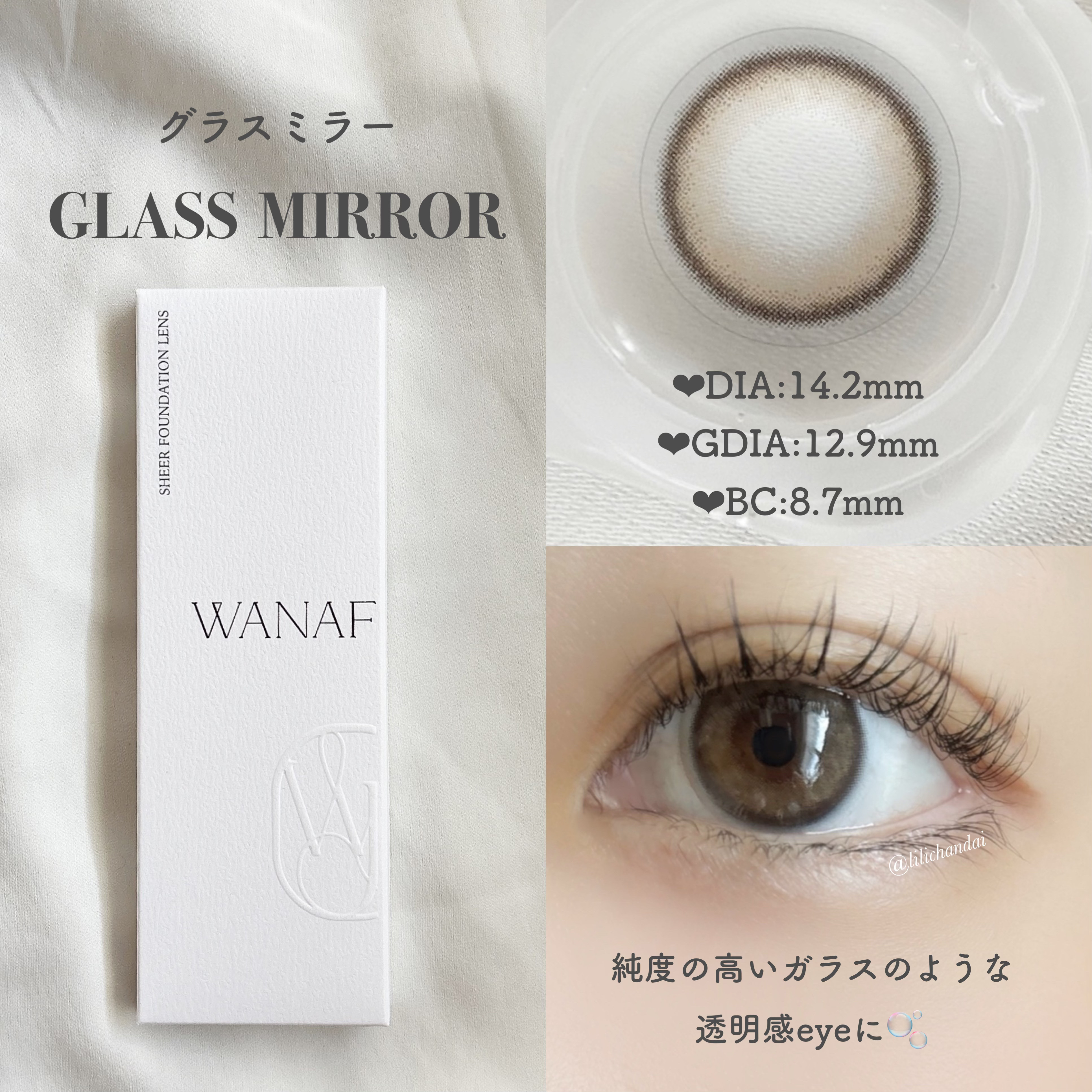 - 肌つやを重ねるように瞳にも艶を重ねる 艶というフィルターを重ねて、瞳の表情をかえる“ファンデ―ションレンズ” 「綺麗」と「色気」を両立 ・CUSHION GLOW クッショングロー レイヤリングする程色づく、自信みなぎる上品発色 パールを砕いたような光沢感のドレッシーカラー。 DIA14.2mm /GDIA 13.55mm ・GLASS MIRROR グラスミラー 純度の高いガラスのような、品格を醸し出すレーシィな発色。 瞳を透明感で満たすエレガントなティントブラウン。 DIA14.2mm /GDIA 12.90mm ・SHY ROUGE シャイルージュ 恥じらいをこめた血色感と美しさをエレベートするエアリー発色。 宝石のような輝きを塗る、ロージーなブラウンルージュ。 DIA14.2mm /GDIA 13.30mm ・SELENE GLOW セレングロー 肌に溶け込むシマーな発色が、 素肌と一体化するグレースグレーをより美しく引き立てる。 DIA14.2mm /GDIA 13.55mm カラーコンタクトレンズの不適正使用による眼障害の危険性等などがあります。 ●コンタクトレンズは高度管理医療機器です。不十分な洗浄・消毒など不適切なケアや、長時間・交換期間を超えた装用により、アレルギー性結膜炎、角膜感染症、角膜潰瘍等の重篤な眼障害が発生する危険性があります ●ご使用前に取扱説明書を確認してください 使用上の留意事項 ●眼科医院等を受診してからお求めください ●眼に異常を感じたら直ちにレンズ使用を中止し、お近くの眼科等で診察を受けてください ●医師の指示にしたがってご使用ください ●コンタクトレンズを装用する場合、自覚症状がなくても、眼科医院等での定期検査を受けてください ●レンズに不具合がある場合は使用しないでください