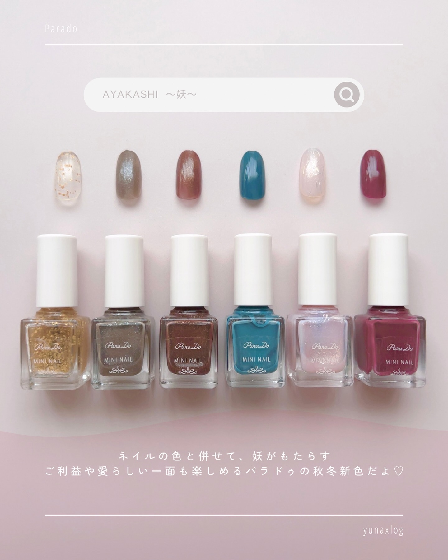 パラドゥミニネイル24年秋冬新色 AYAKASHI~妖~をいただきました! 日本古来からご利益があるといわれている妖たちにインスパイアされたカラーが勢揃い! 385円という安さ! ワンシーズンで使い切れるミニサイズなので飽きることなく堪能できます🍁✨ ネイルの色と併せて妖がもたらすご利益も楽しむことができます😌
