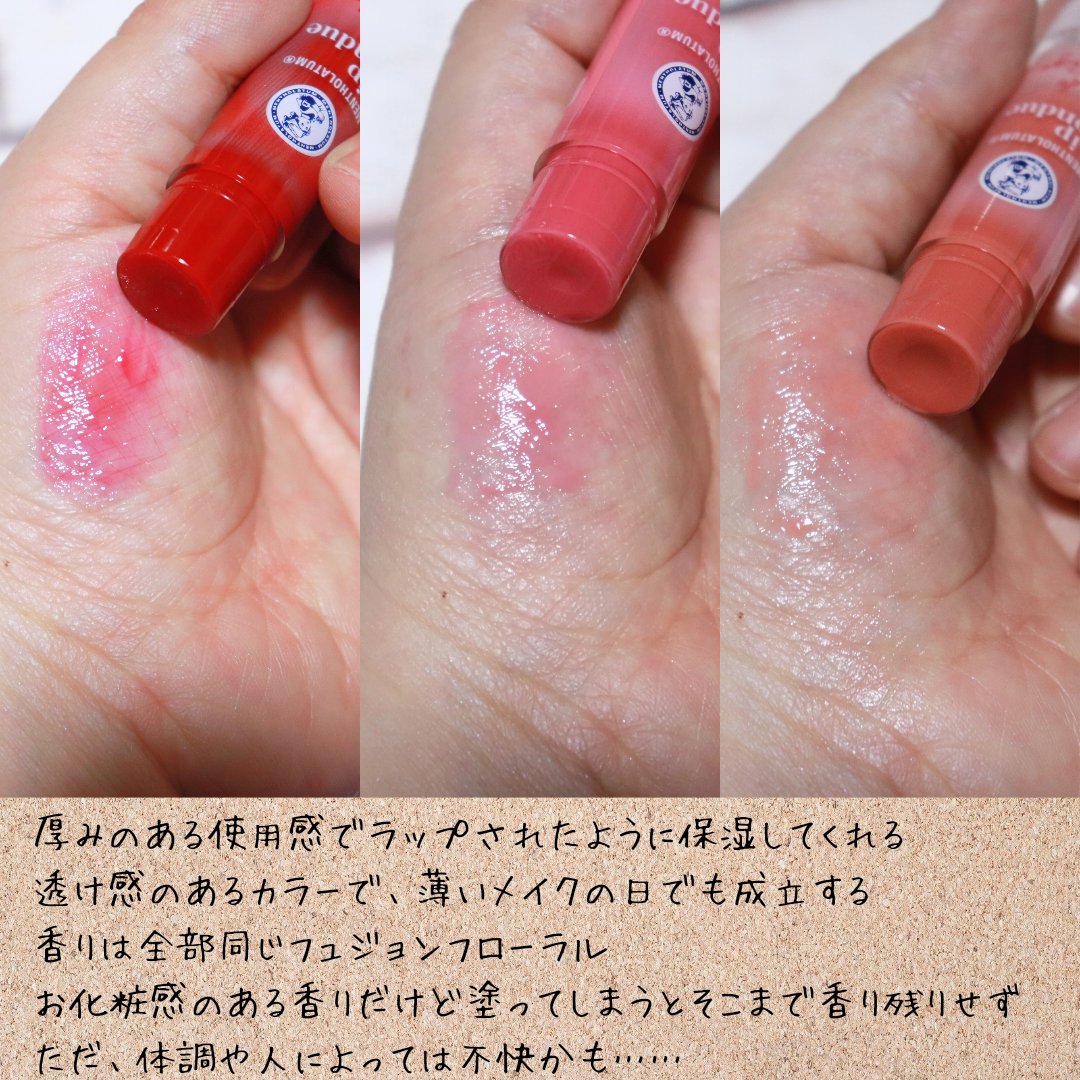 - <クリア> ダイマージリノール酸ダイマージリノレイル、(イソステアリン酸ポリグリセリル2/ダイマージリノール酸) コポリマー、ラノリン、オクチルドデカノール、ホホバ種子油、ジブチルラウロイルグルタミド、ミリスチン酸デキストリン、オリーブ果実油、ローヤルゼリーエキス、ハチミツ、パニリルブチル2、メントキシプロパンジオール、メントール、ハッカ葉油、レモン果皮油、ラバンデュラヒブリダ油、イタリアイトスギ葉/実/茎油、イソステアリン酸ソルビタン、ラブダナム油、ヒメマツバボタンエキス、ダマスクバラ花ロウ、ヤシ脂肪酸スクロース、パルミトイルトリペプチド-381、メトキシケイヒ酸エチルヘキシル、ペンチレングリコール、ポリシリコーン-15、t-ブチルメトキシジベンゾイルメタン、エチルヘキサン酸セテアリル、BG、水 <ヌードベージュ> ダイマージリノール酸ダイマージリノレイル、(イソステアリン酸ポリグリセリル2/ダイマージリノール酸) コポリマー、ラノリン、オクチルドデカノール、ホホバ種子油、ジブチルラウロイルグルタミド、ミリスチン酸デキストリン、メトキシケイヒ酸エチルヘキシル、ペンチレングリコール、トリイソステアリン酸ポリグリセリル-2、メントール、酸化チタン、ポリシリコーン-15、t-ブチルメトキシジベンゾイルメタン、酸化鉄、メントキシプロパンジオール、香料、赤104(1) 水酸化Al、バニリルブチル、オリーブ果実油、ハチミツ、ダマスクバラ花ロウ、エチルヘキサン酸セテアリル、BG、水、ハッカ葉油、レモン果皮油、ラバンデュラヒブリダ油、イタリアイトスギ葉/実/茎油、ヒメマツバボタンエキス、ラブダナム油、イソステアリン酸ソルビタン、ローヤルゼリーエキス、ヤシ脂肪酸スクロース、パルミトイルトリペプチド-38 <ベビーピンク> ダイマージリノール酸ダイマージリノレイル、イソステアリン酸ポリグリセリル2/ダイマージリノール酸)コポリマー、ラノリン、オクチルドデカノール、ホホバ種子油、ジブチルラウロイルグルタミド、ミリスチン酸デキストリン、メトキシケイヒ酸エチルヘキシル、ペンチレングリコール、メントール、トリイソステアリン酸ポリグリセリル-2、酸化チタン、ポリシリコーン-15、t-ブチルメトキシジベンゾイルメタン、メントキシプロパンジオール、香料、黄4、赤202、赤104 (1) 水酸化AI、赤201、バニリルブチル、オリーブ果実油、ダマスクバラ花ロウ、ハチミツ、エチルヘキサン酸セテアリル、BG、水、ハッカ葉油、レモン果皮油、ラバンデュラヒブリダ油、イタリアイトスギ葉/実/茎油、イソステアリン酸ソルビタン、ラブダナム油、ヒメマツバボタンエキス、ローヤルゼリーエキス、ヤシ脂肪酸スクロース、パルミトイルトリペプチド-38 <プラムレッド> ダイマージリノール酸ダイマージリノレイル、(イソステアリン酸ポリグリセリル2/ダイマージリノール酸)コポリマー、ラノリン、オクチルドデカノール、ホホバ種子油、ジブチルラウロイルグルタミド、ミリスチン酸デキストリン、メトキシケイヒ酸エチルヘキシル、ペンチレングリコール、メントール、トリイソステアリン酸ポリグリセリル-2、t-ブチルメトキシジベンゾイルメタン、ポリシリコーン-15、赤202、メントキシプロパンジオール、グンジョウ、香料、赤104(1)、黄4、バニリルプチル2、オリーブ果実油、ハチミツ、ダマスクバラ花ロウ、エチルヘキサン酸セテアリル、BG、水、ハッカ葉油、レモン果皮油、ラバンデュラヒブリダ油、イタリアイトスギ葉/実/莖油、ヒメマツバボタンエキス、ラブダナム油、イソステアリン酸ソルビタン、ローヤルゼリーエキス、ヤシ脂肪酸スクロース、パルミトイルトリペプチド-38 <ロゼピンク> ダイマージリノール酸ダイマージリノレイル、(イソステアリン酸ポリグリセリル2/ダイマージリノール酸) コポリマー、ラノリン、オクチルドデカノール、ホホバ種子油、ジブチルラウロイルグルタミド、ミリスチン酸デキストリン、オリーブ果実油、ローヤルゼリーエキス、ハチミツ、バニリルプチル2、メントキシプロパンジオール、メントール、ハッカ葉油、レモン果皮油、ラバンデュラヒブリダ油、イタリアイトスギ葉/実/莖油 イソステアリン酸ソルビタン、ラブダナム油、ヒメマツバボタンエキス、ダマスクバラ花ロウ、ヤシ脂肪酸スクロース、パルミトイルトリペプチド-381、メトキシケイヒ酸エチルヘキシル、ペンチレングリコール、トリイソステアリン酸ポリグリセリル-2、エチルヘキサン酸セテアリル、BG、水、酸化チタン、ホウケイ酸(Ca/Al)、ポリシリコー15、t-ブチルメトキシジベンゾイルメタン、合成フルオロフロゴパイト、黄4、赤202、赤104 (1) シリカ、赤201、酸化鉄、水酸化Al、酸化スズ、香料