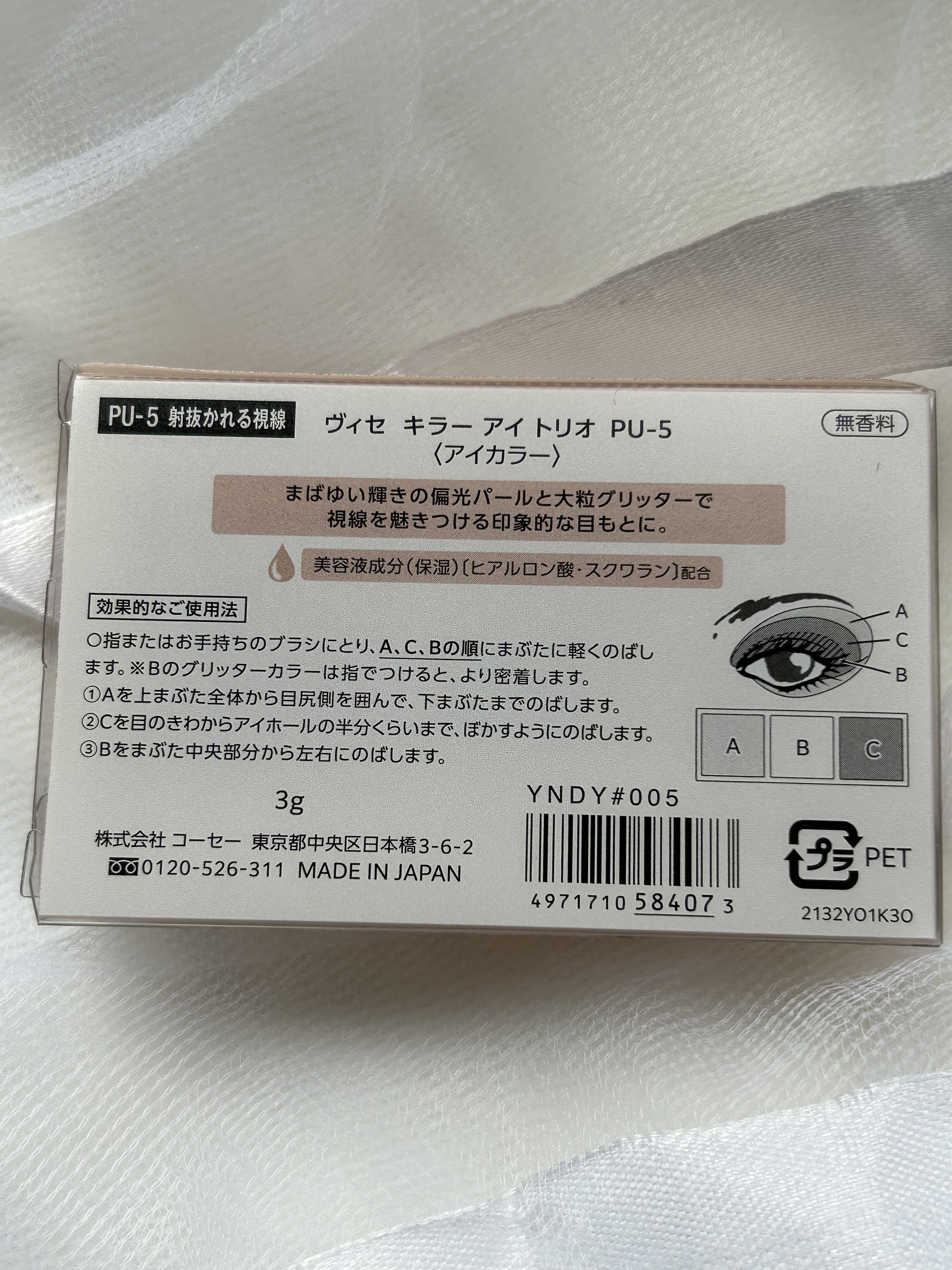 - 角度によって色が変わる高輝度偏光パールを多量配合。動くたび輝きが変化する高密着な3色入りセットアイカラー。 ● 高輝度偏光パールと大粒グリッターを贅沢に配合した、3 色セットのアイカラーです。 まぶたにしっとりとけこむようにフィットして、大粒パールやグリッターも高密着。 大胆に輝き、色気を放つ目もとがつづきます。 ● 見る角度や光の当たり具合により色味が変化する高輝度偏光パール(カラーチェンジグリッター)とクリアで高輝度な大粒グリッターを組み合わせて配合。 まばたきや動きにより色と輝きが変化する、魅力的な目もとを演出します。 ● 化粧もちを高めるフィットオイル成分配合。まぶたにピタッと密着し、パール落ちを防止。 高い透明感とツヤ感も付与し、美しい仕上がりが持続します。 ● カラーによって異なるベースを採用。 [ハイライトカラー(A)] もちっと生質感で、肌にとけこむように密着するスフレベース。 繊細なパールの輝きで、まぶたに光を取りこみ、下地効果でアイカラーの密着も高めます。 [グリッターカラー(B)] 輝きを最大限に引き出す透明性の高いベースに、高輝度偏光パールと大粒グリッターを贅沢に配合。 密着性の高いフィットオイル成分とペーストオイルをかけあわせることで、パール落ちも防止。 [アクセントカラー(C)] のび広がりのよさと高い密着性を両立して美発色を叶えたベース。 フィットオイル成分を最高量配合(パレット内比)し、粉体をコーティングすることで クリアで美しい発色と上質なツヤが持続します。 ● 無香料