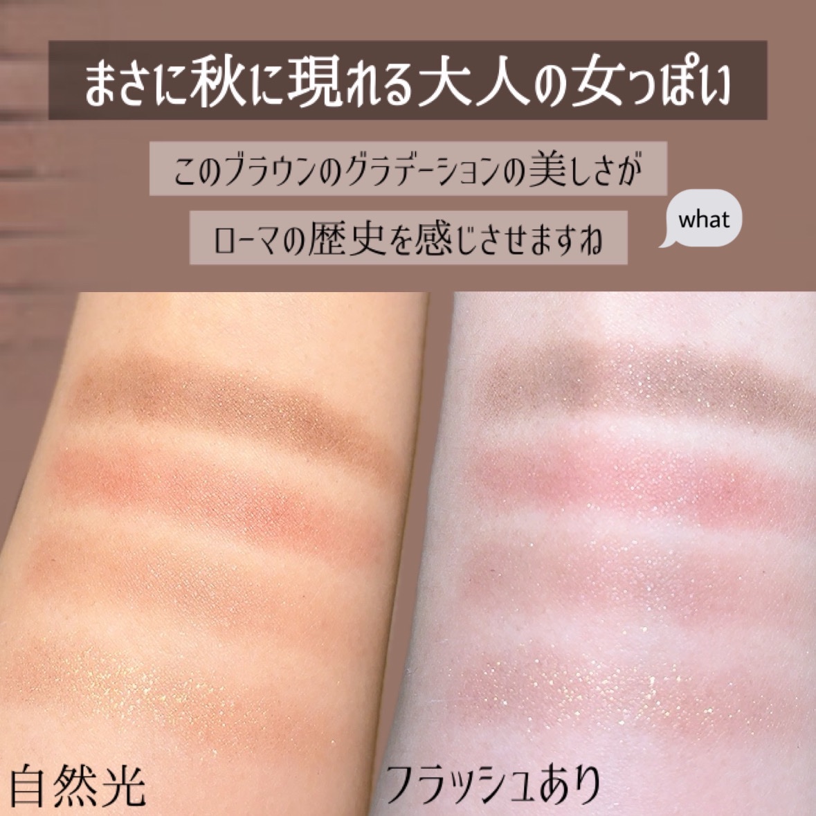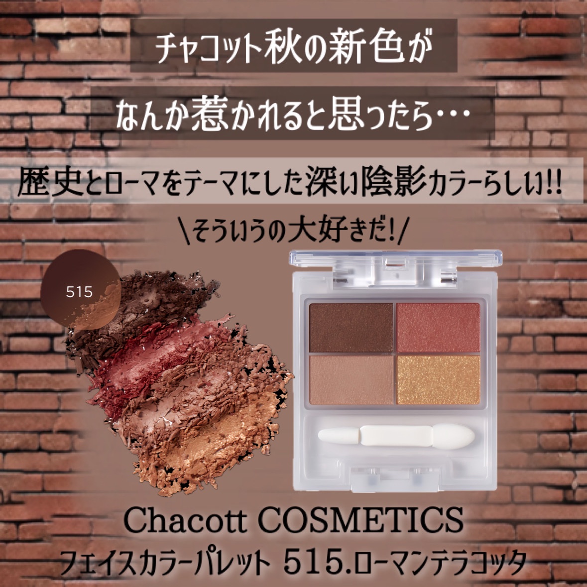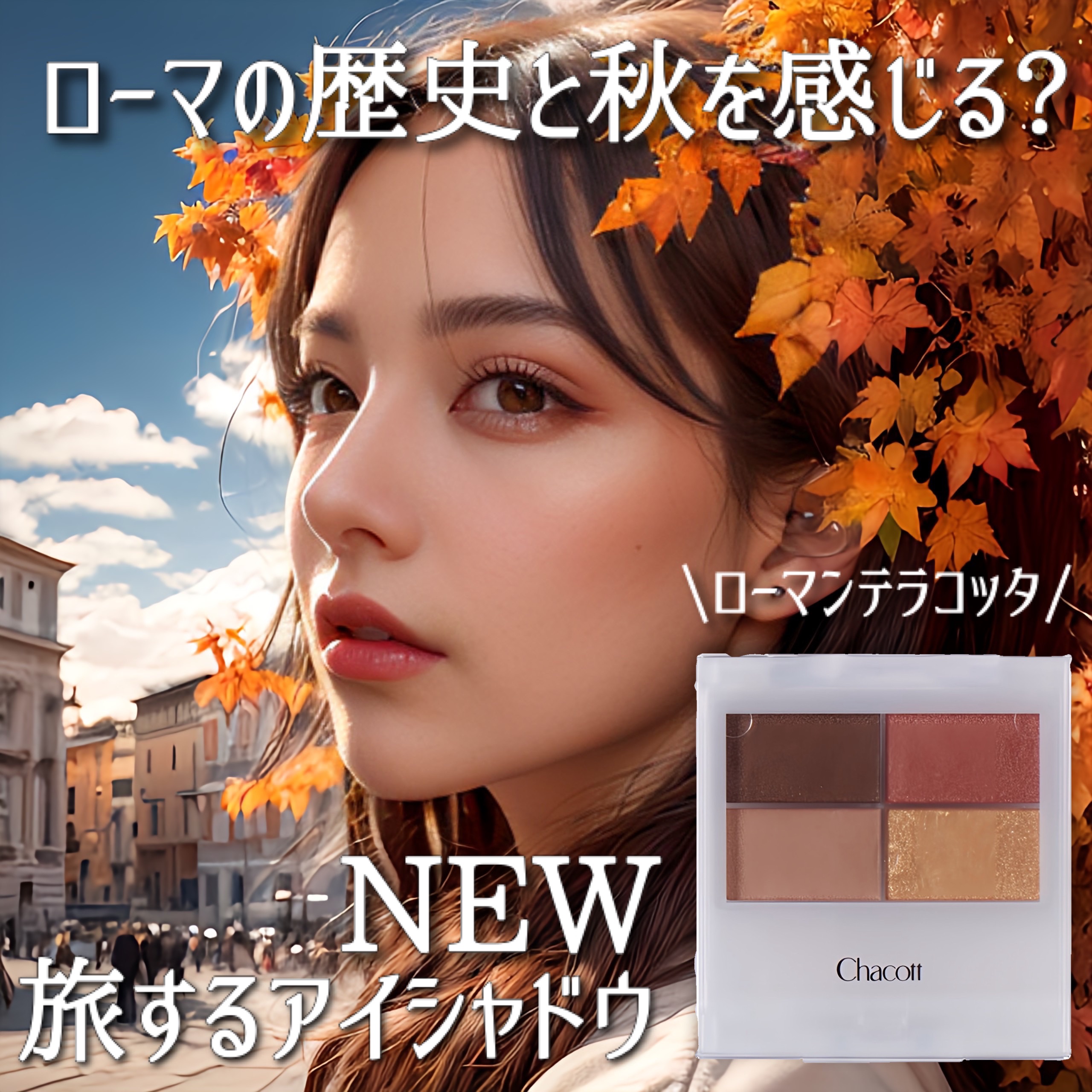 チャコットは使ってるアイテムや気になるアイテムはベース系ばかりで、アイシャドウはノーマークでした🥰 だから初めてのチャコットアイシャドウでわくわく🙌 2024年秋に発売されたこのカラーは、イタリアの風景をイメージした深みのあるグラデーションが特徴でスモーキーな色味がまるでローマの歴史を感じさせる🇮🇹 色はどれも可愛いしなかなかない配色で気に入った💛 友達よ、いいチョイスをありがとう🙏