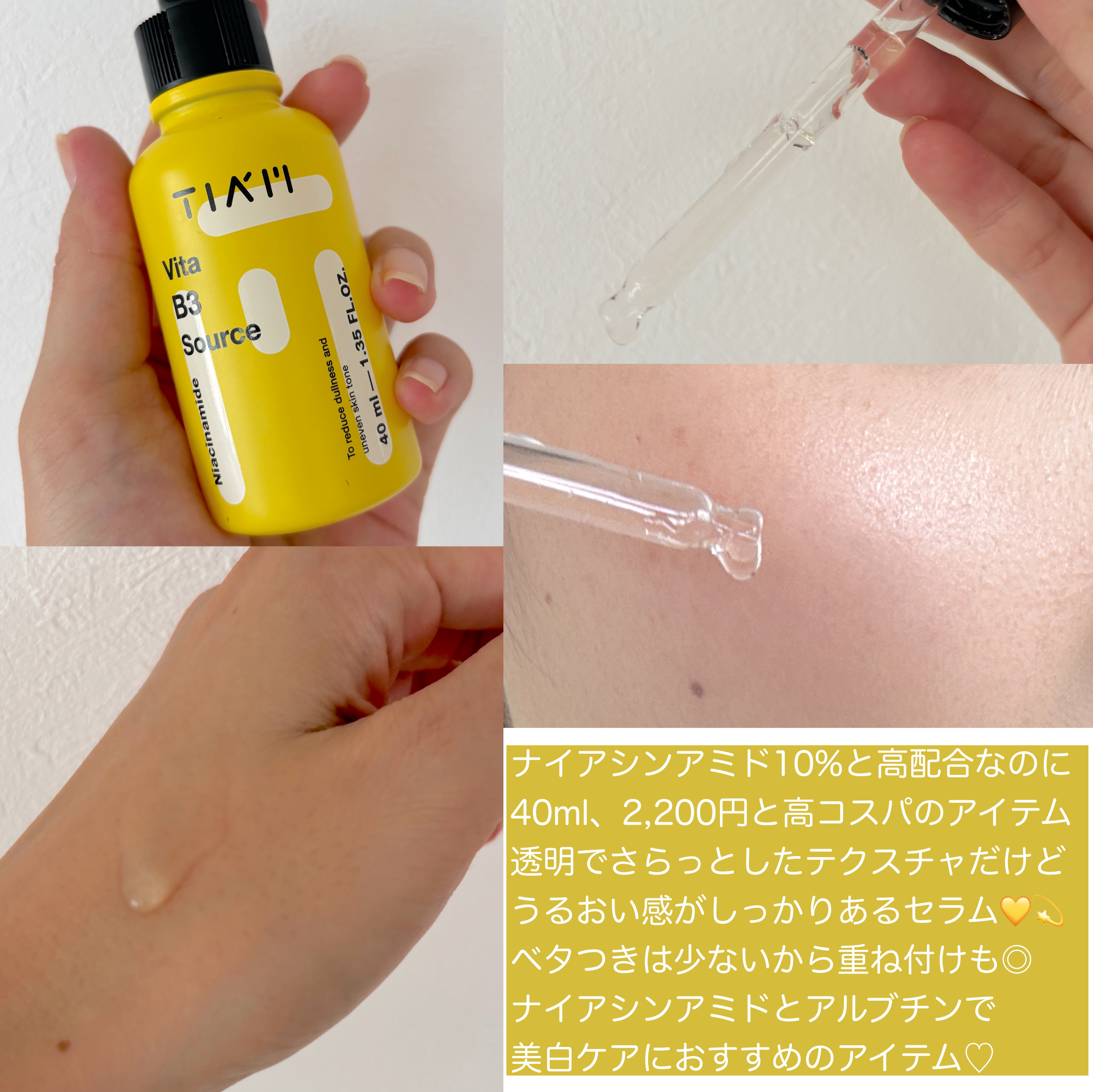 ナイアシンアミドとトラネキサム酸配合! メラニンケアすることで美白を目指せます。 しっかり保湿しながらケアできるので、乾燥肌の方にもおすすめです! ピリピリしたり刺激感もないので敏感肌の方でも使えると思います◎ とろっとした美容液です。 スポイト1回分で全顔、首くらいまで塗れるくらい伸びもいいです! 使用感がしっとりするのにべたべたしないところが好きです! トラネキサム酸も高配合でシミの予防ができるところも心強いです。