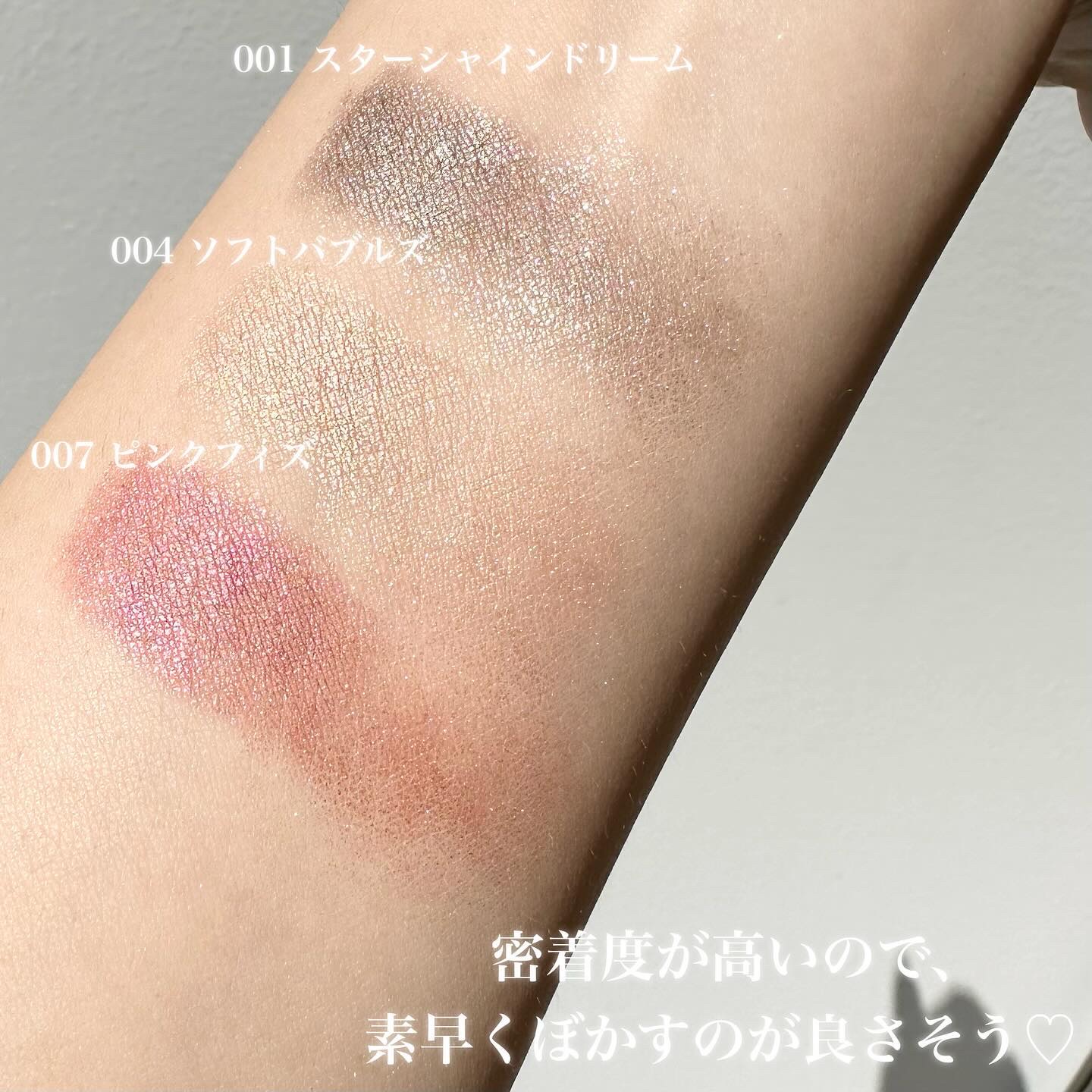 手に試した感じではベースのブルーは弱く、ラメ自体がブルーで可愛すぎる…! BAさんはパウダーアイシャドウのベースにもおすすめと教えてくれたので、 今日はこちらをベースにピンクブラウン系の アイシャドウを使ってメイクしてみたよ🫶🏻 肌に伸ばすとすぐにサラサラになるから ベタベタが残ったりしないし、 パウダーアイシャドウの上に重ねてもヨレない◎