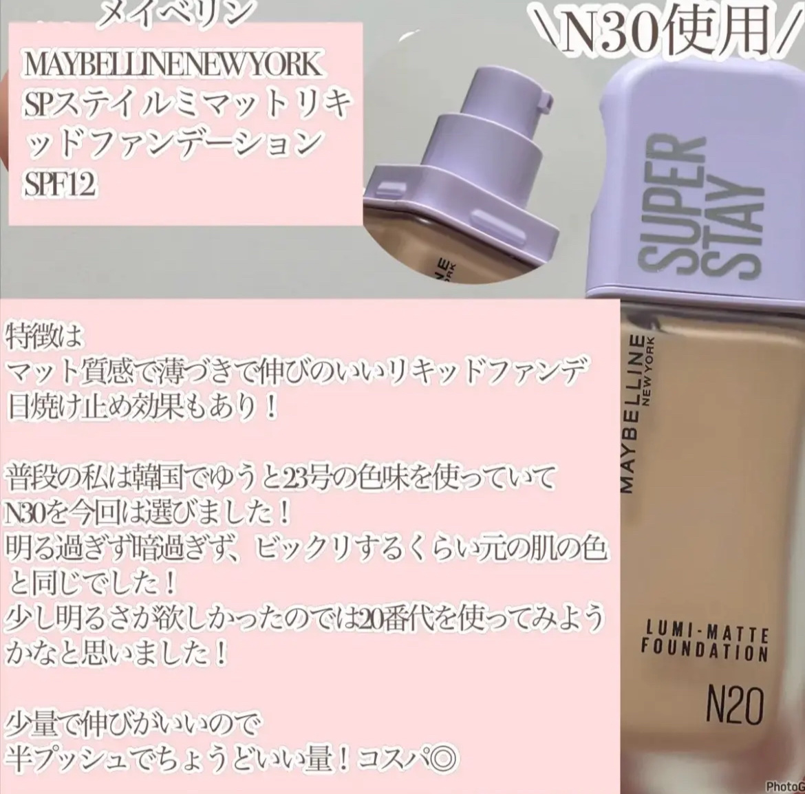 MAYBELLINENEWYORKSPステイルミマットリキッドファンデーションN20プレゼント企画よりいただきました。カバー力とのびは申し分ないです!既にC20、色違いを持ってまして、N20は少し黄身が強いな〜と思いました。#PR#メイベリン...