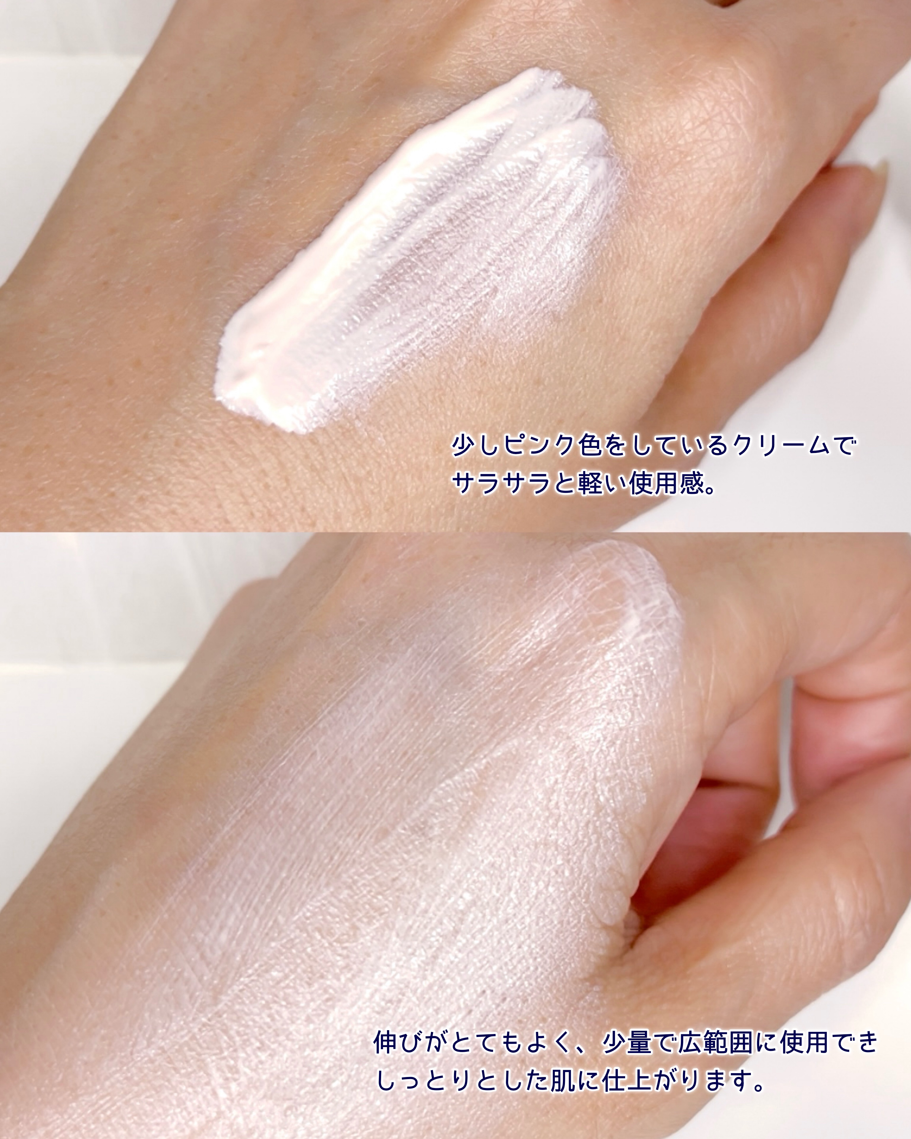 - SPF50+ PA++++ グルタチオン*やナイアシンアミド*が入った、スキンケア効果の高い、化粧下地としても使える日焼け止めです。 さらに、ヒアルロン酸*も入っているので、水分ケアまで可能!冬場でも、長時間乾燥が気になりにくい! スキンケアで肌を潤わしながら、日焼け対策もでき、化粧下地としてベースを整えてくれます。 しっとりとしたテクスチャーですが、仕上がりはベタっとせず、肌の角質層を潤わせるので、メイクの密着力を高め、長時間潤いを感じます。 ほんのりピンクがかった色で、肌に高級感と多幸感を演出してくれます。 *整肌成分